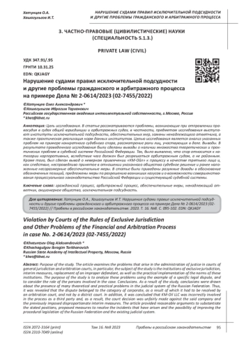 Gavryushkin S.N. Problems of jurisdiction and jurisdiction of disputes related to violation of exclusive rights to various objects of intellectual property on Internet sites // Journal of Economics and Law, 2019, vol. 12 (515), pp. 109 - 114.