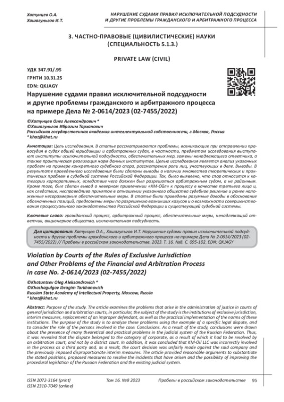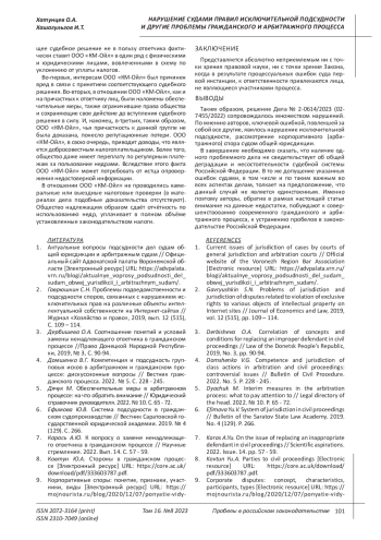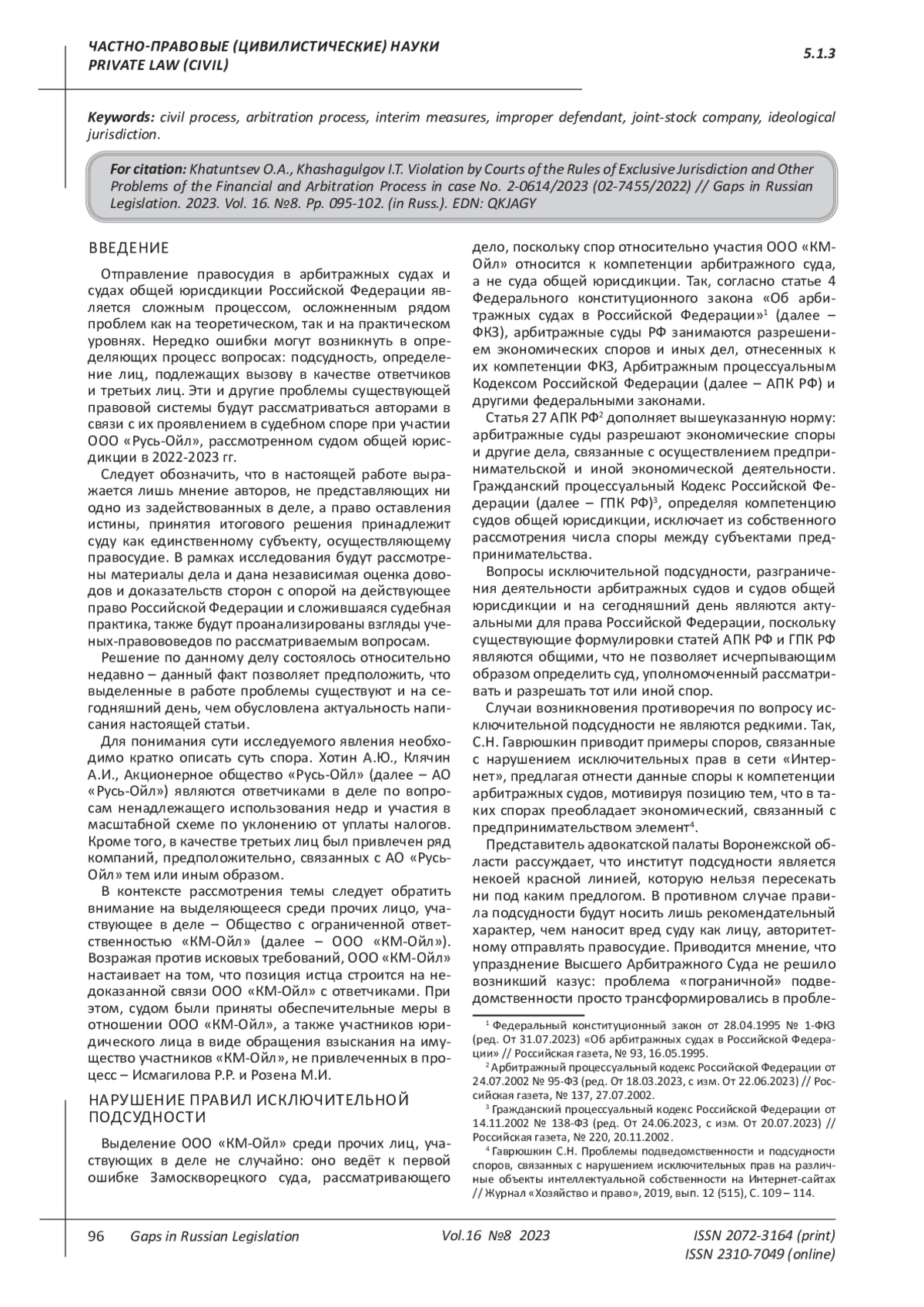 Отправление правосудия в арбитражных судах и судах общей юрисдикции Российской Федерации является сложным процессом, осложненным рядом проблем как на теоретическом, так и на практическом уровнях. Нередко ошибки могут возникнуть в определяющих процесс вопросах: подсудность, определение лиц, подлежащих вызову в качестве ответчиков и третьих лиц. Эти и другие проблемы существующей правовой системы будут рассматриваться авторами в связи с их проявлением в судебном споре при участии ООО «Русь-Ойл», рассмотренном судом общей юрисдикции в 2022-2023 гг.