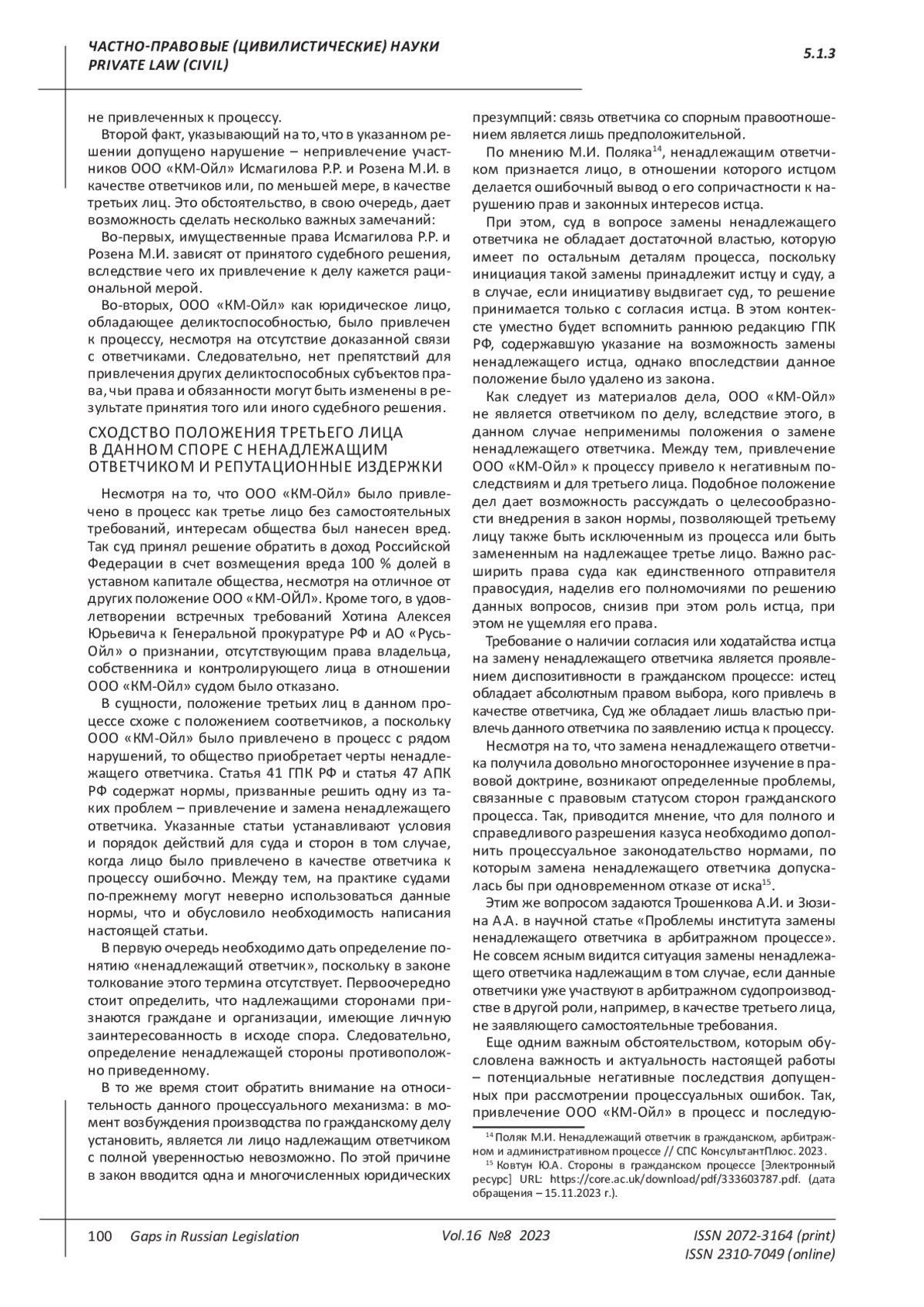 15. Поляк М.И. Ненадлежащий ответчик в гражданском, арбитражном и административном процессе // СПС КонсультантПлюс. 2023.