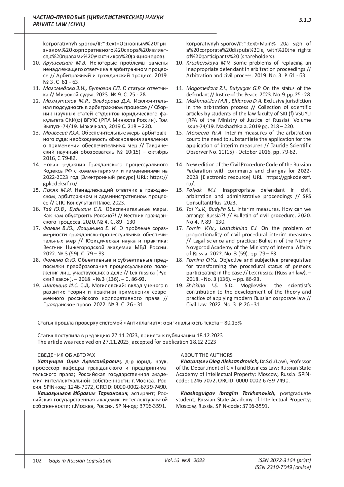 10. Крушевская М.В. Некоторые проблемы замены ненадлежащего ответчика в арбитражном процессе // Арбитражный и гражданский процесс. 2019. № 3. С. 61 - 63. EDN: YZIVRR