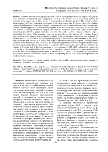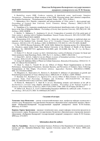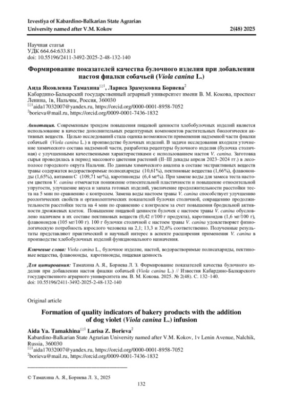 Современным трендом повышения пищевой ценности хлебобулочных изделий является использование в качестве дополнительных рецептурных компонентов растительных биологически активных веществ. Целью исследований стала оценка возможности применения надземной части фиалки собачьей ( Viola canina L.) в производстве булочных изделий. В задачи исследования входили уточнение химического состава надземной части, разработка рецептуры булочного изделия (булочка столичная) с улучшенными качественными характеристиками с использованием настоя V. canina. Заготовка сырья проводилась в период массового цветения растений (II-III декады апреля 2023-2024 гг.) в лесополосе городского округа Нальчик. По данным химического анализа в составе экстрактивных веществ травы содержатся водорастворимые полисахариды (10,61%), пектиновые вещества (1,66%), флавоноиды (1,65%), витамин С (109,71 мг%), каротиноиды (6,4 мг%). При замене воды для замеса теста настоем цветков V. canina отмечается понижение относительной пластичности и повышение относительной упругости, улучшение вкуса и запаха готовых изделий, увеличение продолжительности расстойки теста на 5 мин по сравнению с контролем. Замена воды настоем травы V. canina способствует улучшению реологических свойств и органолептических показателей булочки столичной, сокращению продолжительности расстойки теста на 4 мин по сравнению с контролем за счет повышения бродильной активности дрожжевых клеток. Повышение пищевой ценности булочек с настоем травы V. canina обусловлено наличием в их составе пектиновых веществ (0,42 г/100 г продукта), каротиноидов (1,6 мг/100 г), флавоноидов (105 мг/100 г). 100 г булочки столичной с настоем травы V. canina удовлетворяет физиологическую потребность взрослого человека на 2,1; 13,3 и 32,6% соответственно. Полученные результаты представляют практический и научный интерес в аспекте расширения применения V. canina в производстве хлебобулочных изделий функционального назначения.