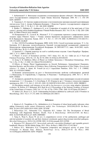 1. Бориева Л. З., Тамахина А. Я., Ахкубекова А. А. Формирование показателей качества пшеничного хлеба при добавлении настоя медуницы мягкой (Pulmonaria mollis) // Новые технологии. 2019. Вып. 3(49). С. 20-29. DOI: 10.24411/2072-0920-2019-10302 EDN: TCXJSC