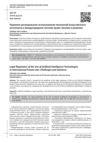Научная статья посвящена проблематике правового регулирования использования технологий искусственного интеллекта в международном частном праве. Раскрываются основные риски, которые связаны с развитие искусственного интеллекта в современном мире и их нормативное регулирование. Кроме того, определены особенности международного законодательства в направлении перспектив регулирования развития и использования технологий искусственного интеллекта в практической деятельности.