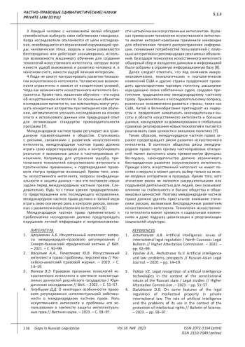 1. Арзуманян А.Б. Искусственный интеллект: вопросы международно-правового регулирования / Северо-Кавказский юридический вестник // ВАК. - 2021. - C. 92-99. EDN: IEAAQU