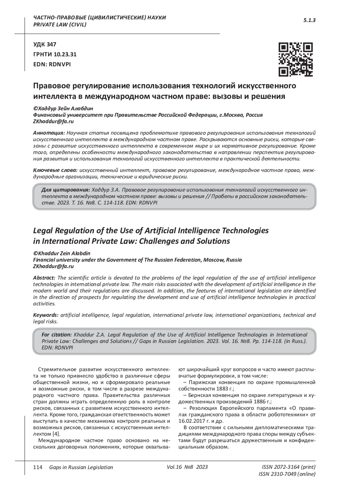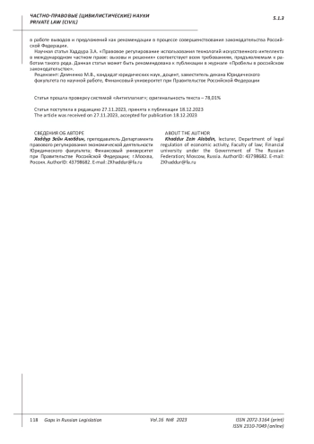 9. Хаддур З.А. Искусственный интеллект и права человека: юридическая и этическая ответственность за ущерб, причиненный технологиями искусственного интеллекта // Право и управление. - 2023. - C. 18-23. EDN: GYTPNH