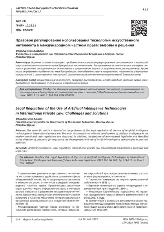 Khaddur Z.A. Artificial intelligence and human rights: legal and ethical responsibility for damage caused by artificial intelligence technologies // Law and Management. - 2023. - pp. 18-23.