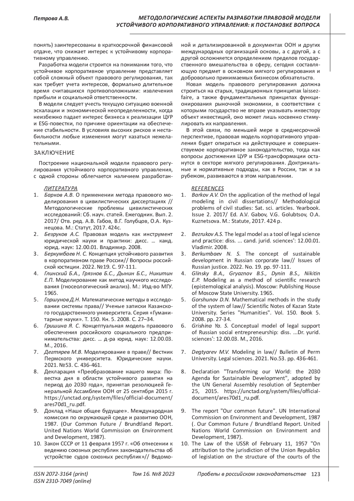 3. Беркумбаев Н. С. Концепция устойчивого развития в корпоративном праве России// Вопросы российской юстиции. 2022. №19. С. 97-111. EDN: MOMCPD