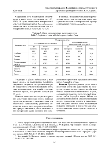 Данная работа посвящена определению изменения аминокислотного состава среды спиртового сусла, осахаренного солодом и поверхностной культурой плесени, до и после пастеризации. Исследования проводились в ООО «Премиум» и на кафедре «Технология производства и переработки сельскохозяйственной продукции» Кабардино-Балкарского ГАУ в 2023-2024 гг. В качестве объектов исследований служили осахаренное сусло до и после пастеризации, бражка, пшеничный солод, культура Aspergillus oryzae. Исследовали кукурузное сусло, осахаренное в первом варианте смесью солодов (ячмень 35, овес 35, просо 30%); во втором - поверхностной культурой плесени Aspergillus oryzae. Установлено, что пастеризация сусла, осахаренного различными агентами, сказывается в большей степени на среде, осахаренной поверхностной культурой плесени Aspergillus oryzae. В этом случае при пастеризации теряется 26,5% аминокислот, в то время как в осахаренном солодом сусле 14,2%. Тенденция к убыли наблюдается у всех шести кислот, за исключением L-лейцина, содержание которого в пастеризованном сусле, осахаренном культурой плесневого гриба, тоже несколько ниже, чем в пробе с пастеризованным суслом. Определено, что при пастеризации среды аминокислотный состав ее существенно не изменяется, однако температурному воздействию больше подвергаются аминокислоты в сусле, осахаренном поверхностной культурой плесневых грибов Aspergillus oryzae. Общее содержание аминокислот в крахмалсодержащих средах, осахаренных солодом и поверхностной культурой плесени, после пастеризации примерно одинаково и достаточно для обеспечения аминным азотом дрожжегенерацию и брожение.