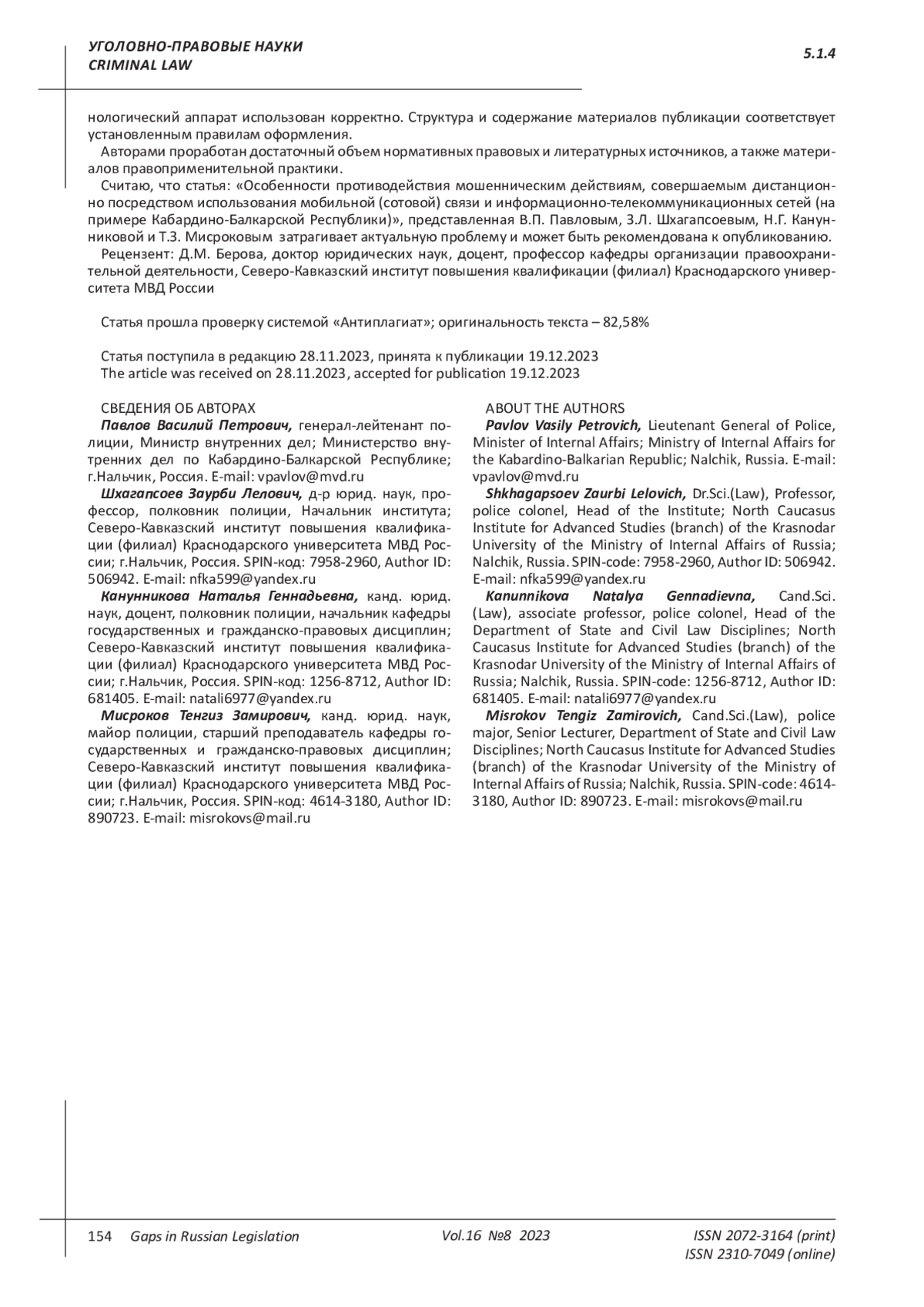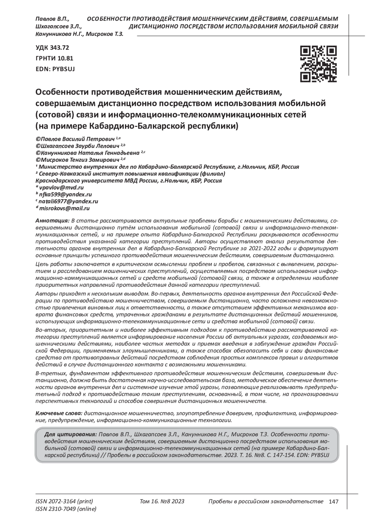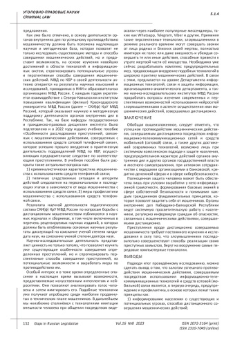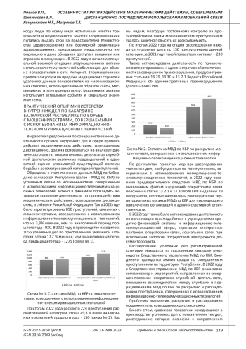 В статье рассматриваются актуальные проблемы борьбы с мошенническими действиями, совершаемыми дистанционно путём использования мобильной (сотовой) связи и информационно-телекоммуникационных сетей, и на примере опыта Кабардино-Балкарской Республики раскрываются особенности противодействия указанной категории преступлений. Авторы осуществляют анализ результатов деятельности органов внутренних дел в Кабардино-Балкарской Республике за 2021-2022 годы и формулируют основные принципы успешного противодействия мошенническим действиям, совершаемым дистанционно. Цель работы заключается в критическом осмыслении проблем и пробелов, связанных с выявлением, раскрытием и расследованием мошеннических преступлений, осуществляемых посредством использования информационно-коммуникационных сетей и средств мобильной (сотовой) связи, а также в определении наиболее приоритетных направлений противодействия данной категории преступлений. Авторы приходят к нескольким выводам. Во-первых, деятельность органов внутренних дел Российской Федерации по противодействию мошенничествам, совершаемым дистанционно, часто осложнена невозможностью привлечения виновных лиц к ответственности, а также отсутствием эффективных механизмов возврата финансовых средств, утраченных гражданами в результате дистанционных действий мошенников, использующих информационно-телекоммуникационные сети и средства мобильной (сотовой) связи. Во-вторых, приоритетным и наиболее эффективным подходом к противодействию рассматриваемой категории преступлений является информирование населения России об актуальных угрозах, создаваемых мошенническими действиями, наиболее частых методах и приемах введения в заблуждение граждан Российской Федерации, применяемых злоумышленниками, а также способах обезопасить себя и свои финансовые средства от противоправных действий посредством соблюдения простых комплексов правил и алгоритмов действий в случае дистанционного контакта с возможными мошенниками. В-третьих, фундаментом эффективного противодействия мошенническим действиям, совершаемым дистанционно, должна быть достаточная научно-исследовательская база, методическое обеспечение деятельности органов внутренних дел и системное изучение этой угрозы, позволяющие реализовывать предупредительный подход к противодействию таким преступлениям, основанный, в том числе, на прогнозировании перспективных технологий и способов совершения дистанционных мошенничеств.