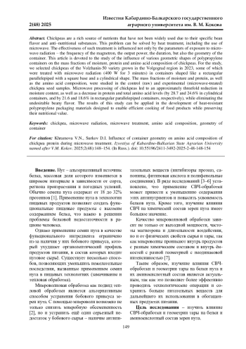 Нут - богатый источник питательных веществ, не получивший широкого применения ввиду наличия у него специфического бобового привкуса и антипитательных веществ. Эту проблему можно решить с помощью тепловой обработки, в том числе с использованием СВЧ. На эффективность такой обработки влияют не только параметры воздействия микроволнового излучения - частота магнетрона, выходная мощность, продолжительность, но и геометрия тары. Данная статья посвящена изучению влияния различных геометрических форм полипропиленовой тары на массовые доли влаги, белка и аминокислотный состав нута. Для исследования отобраны зерна нута сорта «Волжанин-50», выращенные в Волгоградской области в 2023 году, часть из которых обработана микроволновым излучением (400 Вт в течение 3 минут) в емкостях, имеющих форму прямоугольного параллелепипеда с квадратным основанием и цилиндрическую форму. В контрольном (сырых) и опытных (обработанных СВЧ) образцах семян нута исследованы массовые доли влаги и белка, аминокислотный состав. Микроволновая обработка зерен нута привела к уменьшению массовой доли влаги (в среднем в 3 раза), белка и суммарного содержания аминокислот (в цилиндрической таре - на 28,7 и 24,6%; в ѐмкости в форме прямоугольного параллелепипеда - на 21,6 и 18,6% соответственно), но позволила устранить нежелательный бобовый привкус. Результаты работы могут найти применение при проектировании новых термостойких полипропиленовых упаковочных материалов, предназначенных для эффективного доведения пищевой продукции до кулинарной готовности с сохранением наибольшего количества питательных веществ.