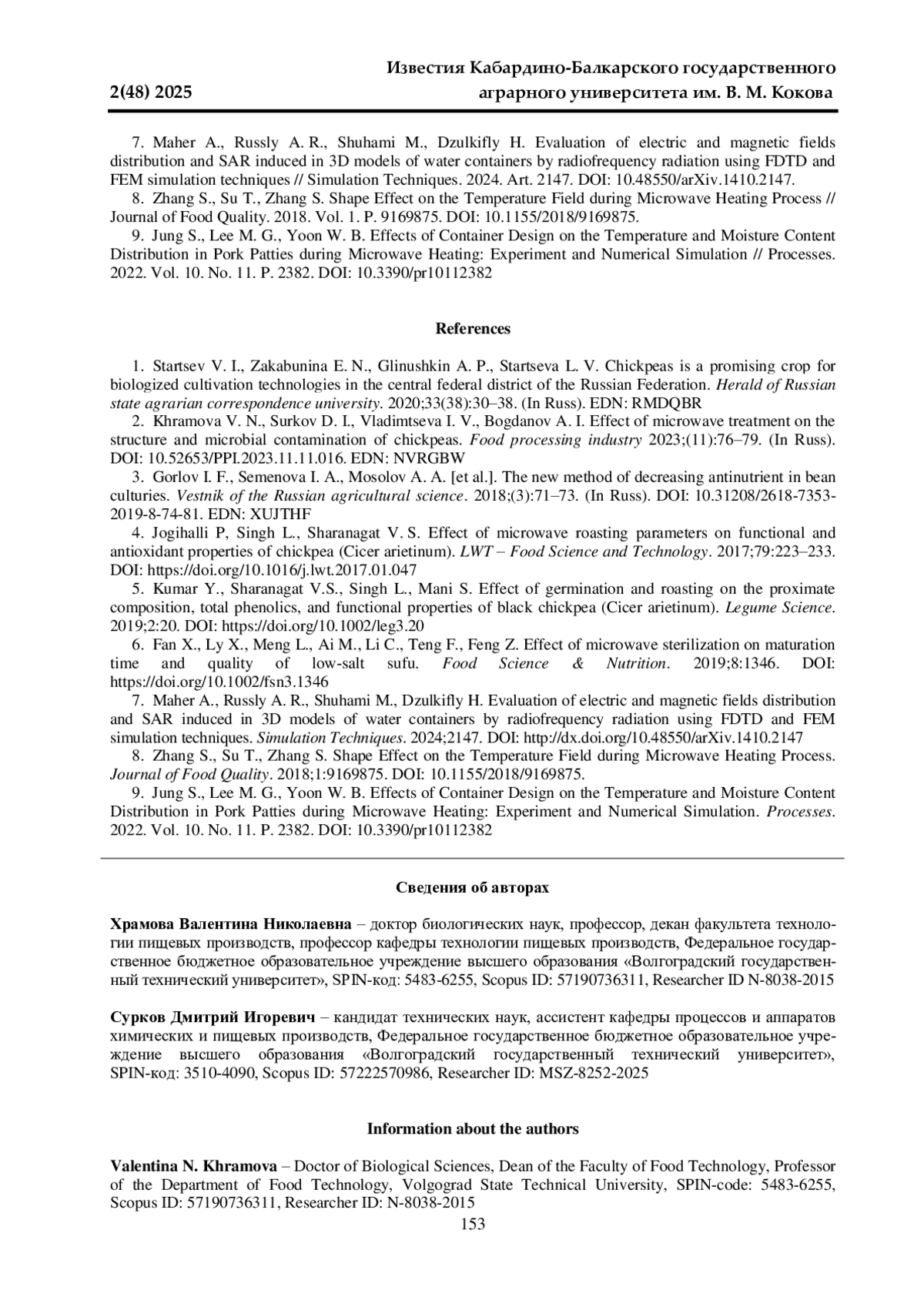 4. Jogihalli P, Singh L., Sharanagat V. S. Effect of microwave roasting parameters on functional and antioxidant properties of chickpea (Cicer arietinum) // LWT - Food Science and Technology. 2017. Vol. 79. Pp. 223-233. DOI: 10.1016/j.lwt.2017.01.047