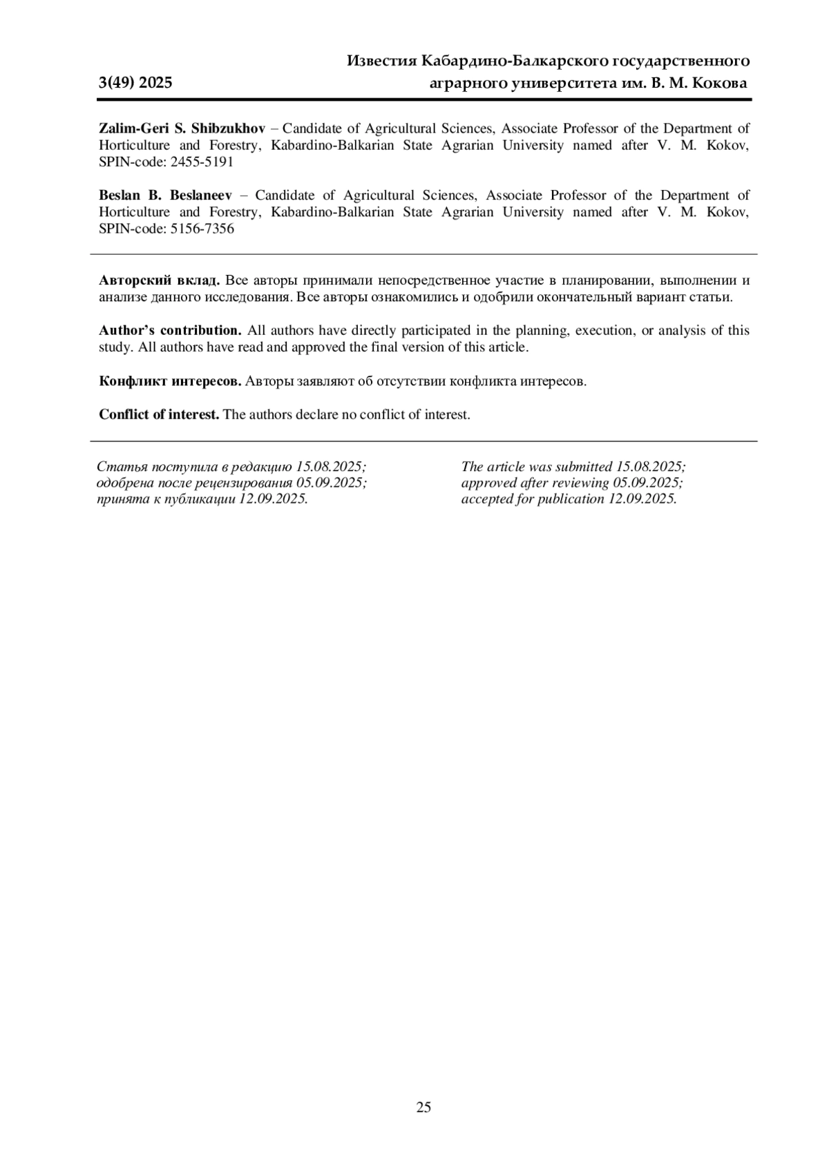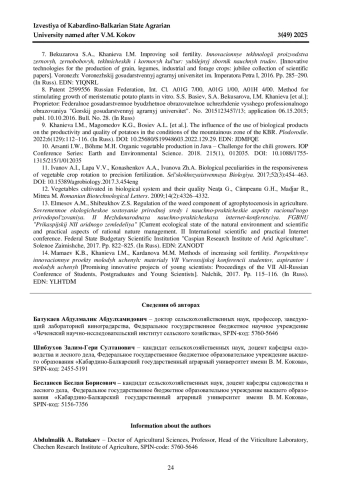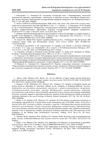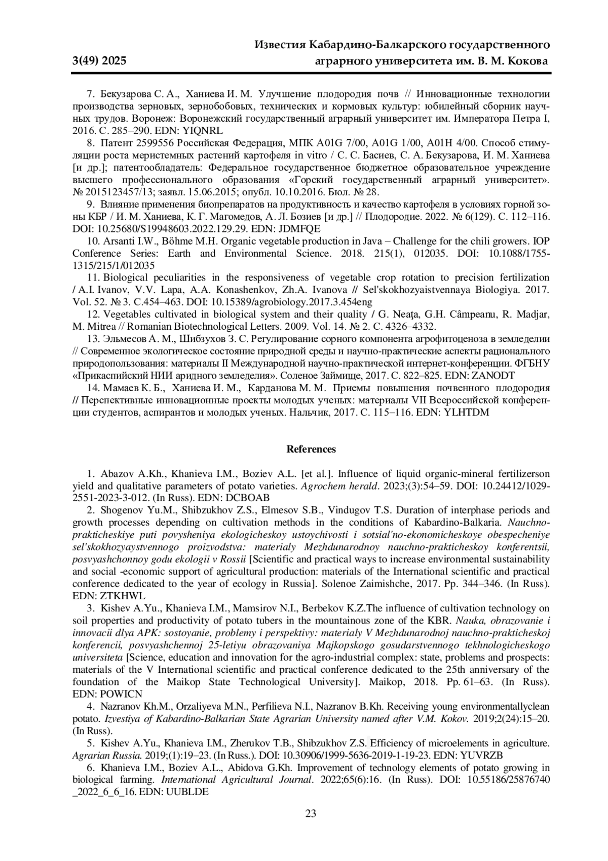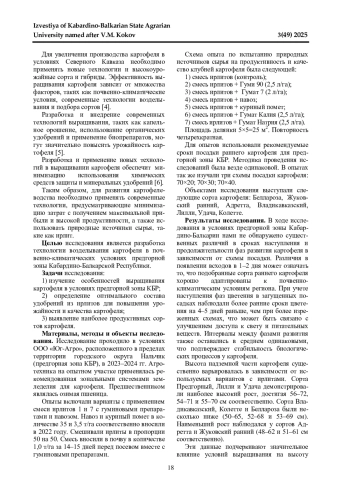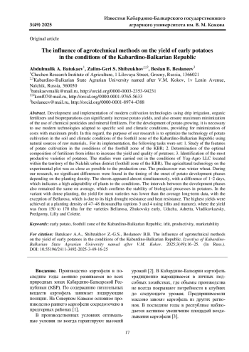 Разработка и внедрение современных технологий выращивания с использованием капельного орошения, органических удобрений и биопрепаратов могут значительно повысить урожайность картофеля, а также обеспечить минимизацию использования химических средств защиты и минеральных удобрений. Для развития картофелеводства необходимо применять современные технологии адаптированные под конкретные почвенно-климатические условия, предусматривающие минимизацию затрат с получением максимальной прибыли. В связи с этим целью нашего исследования является оптимизация технологии возделывания картофеля в почвенно-климатических условиях предгорной зоны Кабардино-Балкарской Республики с использованием природных источников сырья. Для ее реализации были поставлены следующие задачи: 1) изучение особенностей выращивания картофеля в условиях предгорной зоны КБР; 2) определение оптимального состава удобрений из ирлитов для повышения урожайности и качества картофеля; 3) выявление наиболее продуктивных сортов картофеля. Исследование проходило в условиях ООО «Юг-Агро», расположенного в пределах территории городского округа Нальчик. Агротехника на опытном участке максимально приближена к производственным. Предшественником являлась озимая пшеница. В ходе исследования не было выявлено значительных различий в сроках фаз развития картофеля в зависимости от густоты посадки. Всходы появлялись почти одновременно, с разницей в 1-2 дня, что свидетельствует о высокой адаптивности растений к условиям. Интервалы между фазами развития также оставались в среднем одинаковыми, что подтверждает стабильность биологических процессов у картофеля. В варианте с загущенной посадкой урожайность по большинству сортов была ниже средне-многолетних данных, за исключением Беллароза, что связано с его высокой засухоустойчивостью и жаростойкостью. Наивысшие показатели урожайности были достигнуты при густоте посадки 47-48 тыс./га (варианты 3 и 4 с использованием ирлитов и навоза), где урожайность составила от 150 до 170 т/га по сортам Беллароза, Жуковский ранний, Удача, Адретта, Владикавказский, Предгорный, Лилли и Колетте.