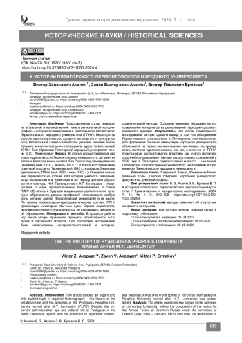 АКОПЯН В. З., АКОПЯН З. В., ЕРМАКОВ В. П. К ИСТОРИИ ПЯТИГОРСКОГО ЛЕРМОНТОВСКОГО НАРОДНОГО УНИВЕРСИТЕТА // ГУМАНИТАРНЫЕ И ЮРИДИЧЕСКИЕ ИССЛЕДОВАНИЯ. 2024. ТОМ 11, № 4