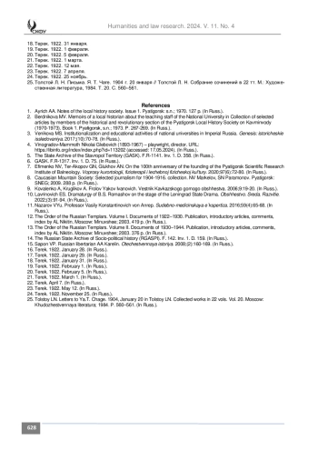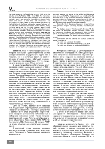 Введение. Представленная статья посвящена актуальной и малоизученной теме в региональной историографии – истории возникновения и деятельности Пятигорского Лермонтовского народного университета (ПЛНУ). Несмотря на важную административную, курортно-санаторную и культурную роль Пятигорска в Северо-Кавказском регионе, наличие значительного интеллектуального потенциала, здесь только весной 1918 г. был образован Пятигорский народный университет имени М. Ю. Лермонтова. Анализ. В статье рассматриваются два этапа в деятельности Лермонтовского университета: до занятия региона Вооруженными силами Юга России под командованием Деникина (май 1918 – январь 1919 г.) и после восстановления советской власти на Тереке весной 1920 г., когда возобновилась деятельность ПЛНУ (май 1920 – июнь 1922 г.). Основное внимание обращается на второй этап истории учебного заведения, когда его возглавляли известные в тот период деятели образования и культуры Н. И. Проферансов и Н. Г. Виноградов – люди, далекие от идей, провозглашенных большевиками. В стенах ПЛНУ обучались в будущем выдающиеся деятели науки, культуры, образования, разных профессий, признававшие особую роль, которую сыграл Лермонтовский университет в их жизни. По своему профессорско-преподавательскому составу ПЛНУ превосходил некоторые обычные вузы. Однако слушателям, окончившим соответствующие курсы, не выдавались документы об образовании.