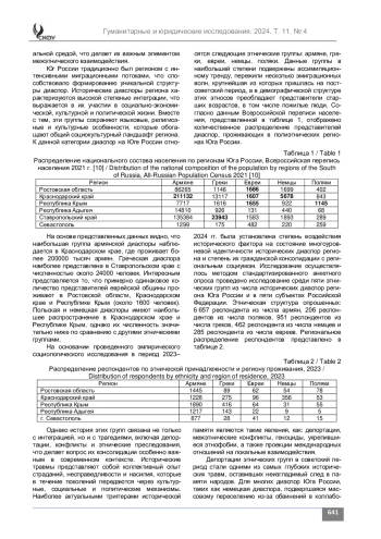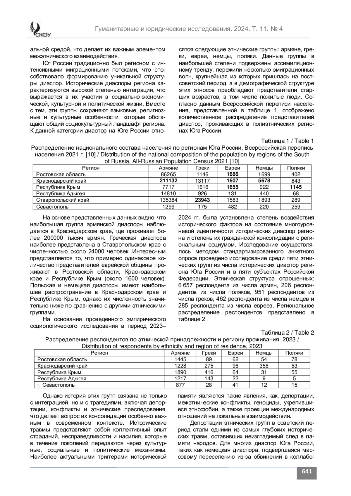 Анализ. Миграционные потоки, стимулируемые геополитическими процессами, способствовали последовательному формированию на Юге России широкого круга этнических диаспор, постепенно вписывавшихся в региональные экономические, социальные, политические и культурные процессы. Естественный процесс пространственной и ментальной адаптации позволили сконструировать устойчивые механизмы внутреннего взаимодействия диаспорных структур и автохтонного населения, опирающиеся как на исторический опыт, так и на практическое восприятие динамичной общественной жизни. Практическое регулирование складывающихся взаимоотношений нередко осуществлялось властными структурами, использовавшими силовые методы и сформировавшими глубокие ментальные травмы, влияющие и на современное состояние межэтнических контактов.