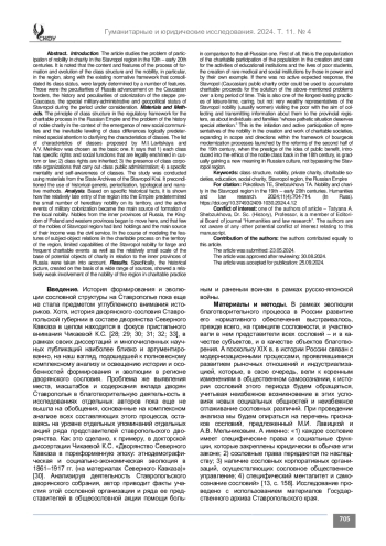 Введение. Статья посвящена исследованию проблемы участия дворян в благотворительном процессе на Ставрополье в XIX – начале XX вв. Отмечается, что содержание и особенности процесса становления и эволюции сословной структуры и оформления, в частности, дворянского сословия в изучаемом регионе, наряду с существовавшими нормативными рамками, закреплявшими его сословный статус, во-многом определялись спецификой продвижения России на кавказских рубежах, историей и особенностями колонизации степного предкавказья, особым военно-административным и геополитическим статусом Ставрополя в изучаемый период.