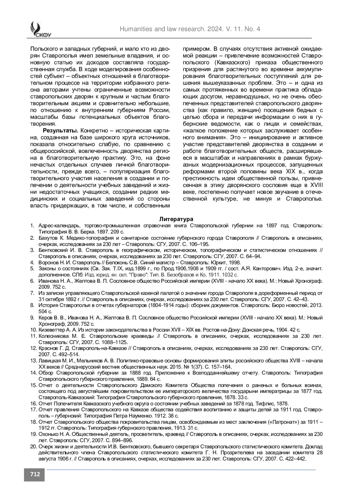 Результаты. Конкретно – историческая картина, созданная на базе широкого круга источников, показала относительно слабую, по сравнению с общероссийской, вовлеченность дворянства региона в благотворительную практику. Это, на фоне нечастых отдельных случаев личной благотворительности, прежде всего, - популяризация благотворительного участия населения в создании и попечении о деятельности учебных заведений и жизни недостаточных учащихся, создании редких медицинских и социальных заведений со стороны власть придержащих, в том числе, и собственным примером. В случаях отсутствия активной ожидаемой реакции – привлечение возможностей Ставропольского (Кавказского) приказа общественного призрения для растянутого во времени аккумулирования благотворительных поступлений для решения вышеуказанных проблем. Это - и одна из самых протяженных во времени практика обладающих досугом, неравнодушных, но не очень обеспеченных представителей ставропольского дворянства (как правило, женщин) посещения бедных с целью сбора и передачи информации о них в губернские ведомости, как о лицах и семействах, «жалкое положение которых заслуживает особенного внимания». Это – инициирование и активное участие представителей дворянства в создании и работе благотворительных обществ, расширявшееся в масштабах и направлениях в рамках буржуазных модернизационных процессов, запущенных реформами второй половины века XIX в., когда престижность идеи общественной пользы, привнесенная в этику дворянского сословия еще в XVIII веке, постепенно получает новое звучание в отечественной культуре, не минуя и Ставрополье.
