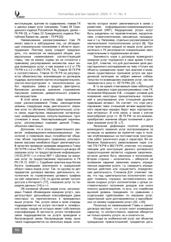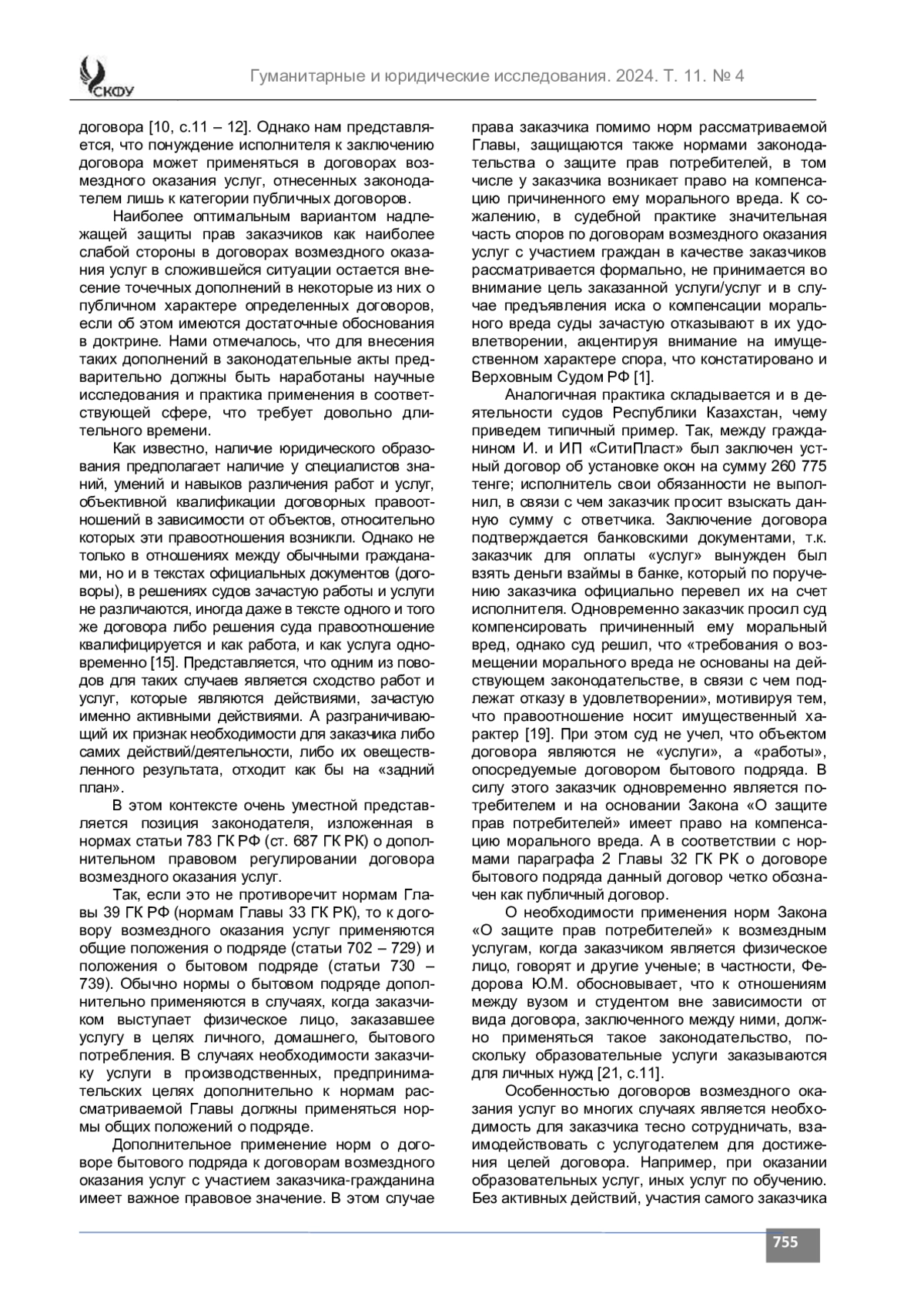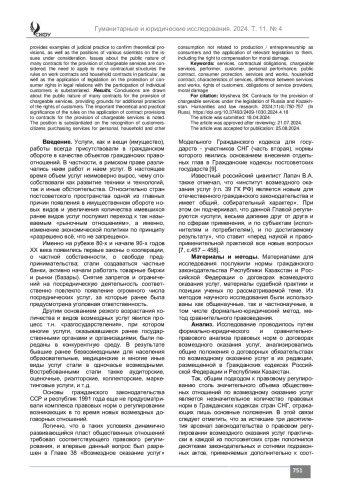 Анализ. Исследование построено на анализе общих положений о договорных обязательствах по возмездному оказанию услуг на примерах их изложения в Гражданских кодексах Российской Федерации и Республики Казахстан. Приводятся авторские обоснования объединения большого массива договорных конструкций в одной небольшой по объему главе Гражданского кодекса. При рассмотрении гражданско-правовой характеристики договоров возмездного оказания услуг автором приводятся примеры судебной практики для подтверждения теоретических положений, а также позиции различных ученых по рассматриваемым вопросам. Рассмотрены вопросы о публичном характере многих договоров возмездного оказания услуг, обосновывается необходимость применения ко многим договорным конструкциям норм о договорах подряда и бытового подряда, в частности, а также о применении законодательства о защите прав потребителей в правоотношениях с участием заказчиков-физических лиц.