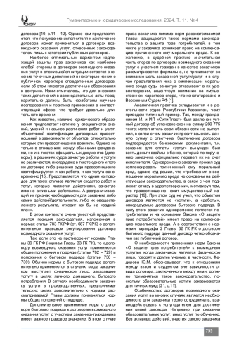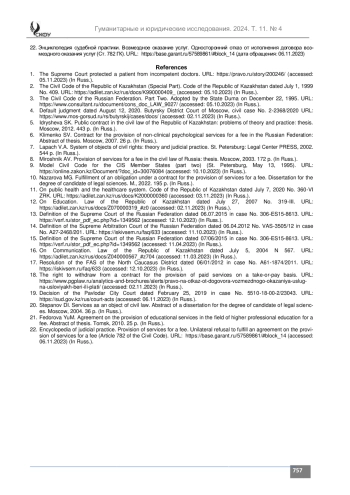 Материалы и методы. Материалами для исследования послужили нормы гражданского законодательства Республики Казахстан и Российской Федерации о договорах возмездного оказания услуг, материалы судебной практики и высказанные в доктрине позиции ученых по рассматриваемой теме. Из методов научного исследования были использованы как общенаучные, так и частно-научные, в том числе формально-юридический метод, метод сравнительного правоведения.