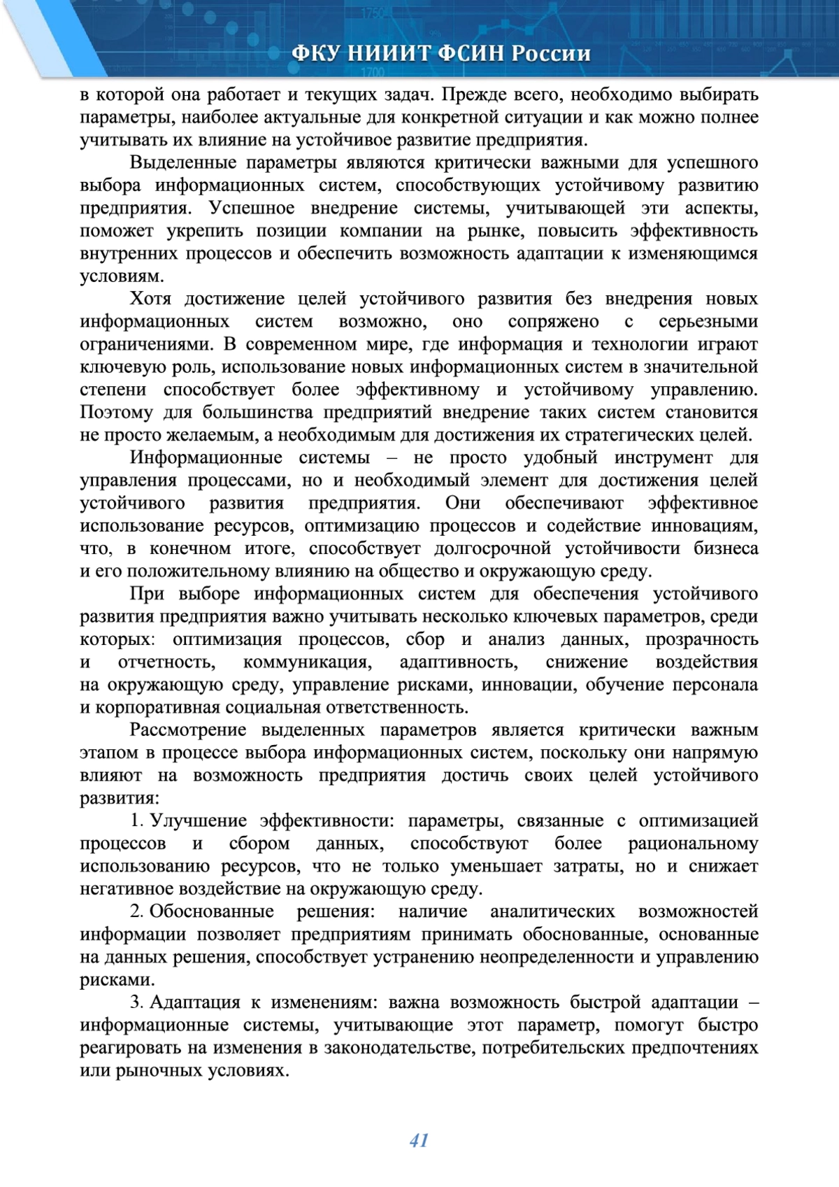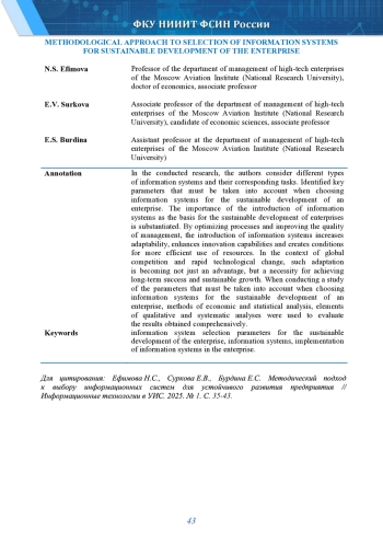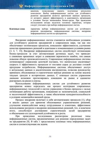 В проведённом исследовании авторами рассматриваются различные типы информационных систем и соответствующие им задачи. Выделены ключевые параметры, которые необходимо учитывать при выборе информационных систем для устойчивого развития предприятия. Обоснована важность внедрения информационных систем как основы устойчивого развития предприятий. Оптимизируя процессы и улучшая качество управления, внедрение информационных систем повышает адаптивность, усиливает инновационные способности и создает условия для более эффективного использования ресурсов. В условиях глобальной конкуренции и быстрого изменения технологий такая адаптация становится не просто преимуществом, а необходимостью для достижения долговременного успеха и устойчивого роста. При проведении исследования параметров, которые необходимо учитывать при выборе информационных систем для устойчивого развития предприятия, были использованы методы экономико-статистического анализа, элементы качественного и системного анализов, позволяющие оценить полученные результаты комплексно. Выбор информационных систем для устойчивого развития предприятия является критически важным процессом, от которого зависит эффективность и адаптивность организации в условиях быстро меняющейся бизнес-среды. При проведении исследования авторы выделили основные параметры, которые следует учитывать при выборе информационных систем.