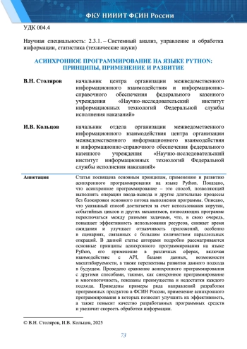 СТОЛЯРОВ В. Н., КОЛЬЦОВ И. В. АСИНХРОННОЕ ПРОГРАММИРОВАНИЕ НА ЯЗЫКЕ PYTHON: ПРИНЦИПЫ, ПРИМЕНЕНИЕ И РАЗВИТИЕ // ИНФОРМАЦИОННЫЕ ТЕХНОЛОГИИ В УИС. 2025. № 1