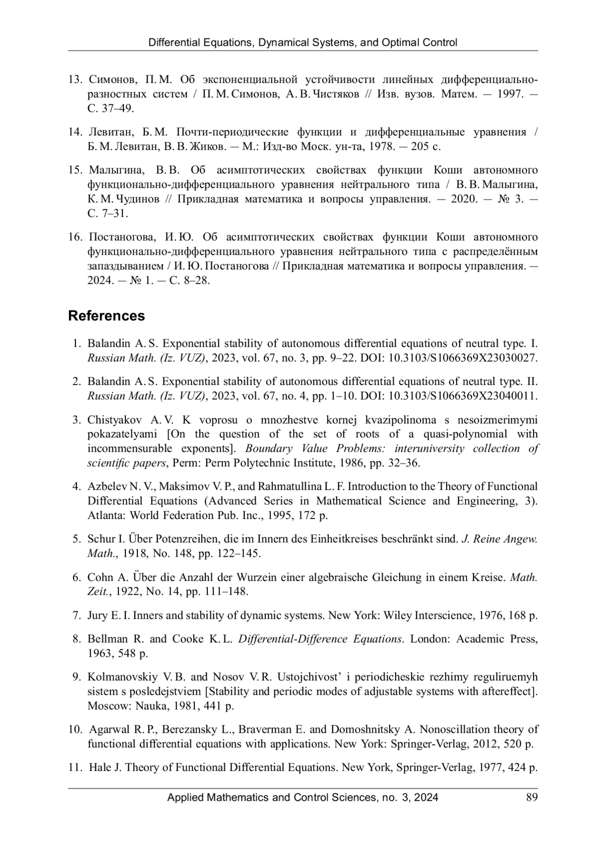 1. Баландин, А. С. Экспоненциальная устойчивость автономных дифференциальных уравнений нейтрального типа. I / А. С. Баландин // Изв. вузов. Матем. - 2023. - № 3. - С. 12-28. EDN: USYUZO