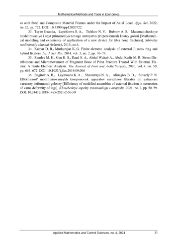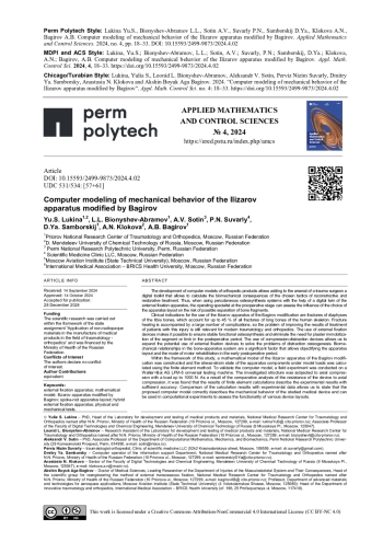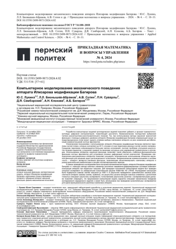 ЛУКИНА Ю. С., БИОНЫШЕВ-АБРАМОВ Л. Л., СОТИН А. В., СУВАРЛЫ П. Н., САМБОРСКИЙ Д. Я., КЛОКОВА А. Н., БАГИРОВ А. Б. КОМПЬЮТЕРНОЕ МОДЕЛИРОВАНИЕ МЕХАНИЧЕСКОГО ПОВЕДЕНИЯ АППАРАТА ИЛИЗАРОВА МОДИФИКАЦИИ БАГИРОВА // ПРИКЛАДНАЯ МАТЕМАТИКА И ВОПРОСЫ УПРАВЛЕНИЯ. 2024. № 4