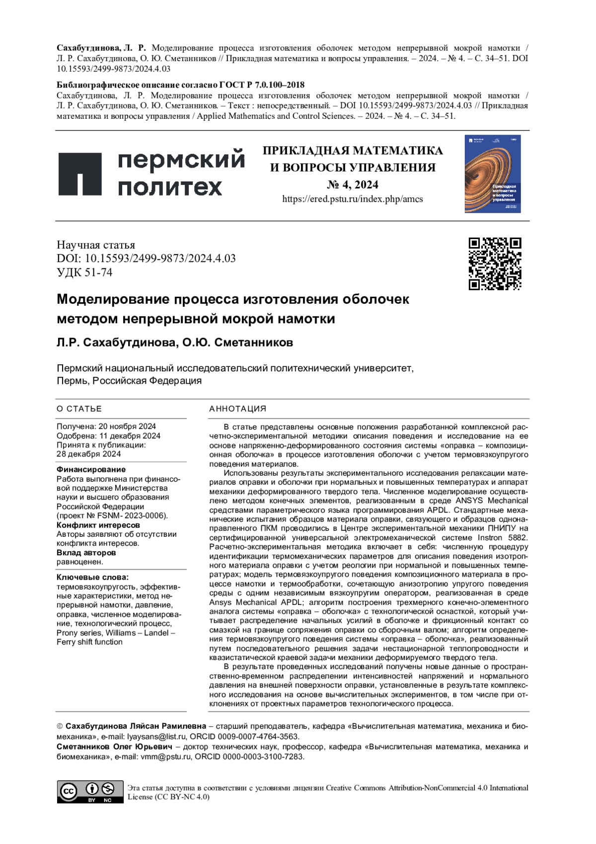 САХАБУТДИНОВА Л. Р., СМЕТАННИКОВ О. Ю. МОДЕЛИРОВАНИЕ ПРОЦЕССА ИЗГОТОВЛЕНИЯ ОБОЛОЧЕК МЕТОДОМ НЕПРЕРЫВНОЙ МОКРОЙ НАМОТКИ // ПРИКЛАДНАЯ МАТЕМАТИКА И ВОПРОСЫ УПРАВЛЕНИЯ. 2024. № 4