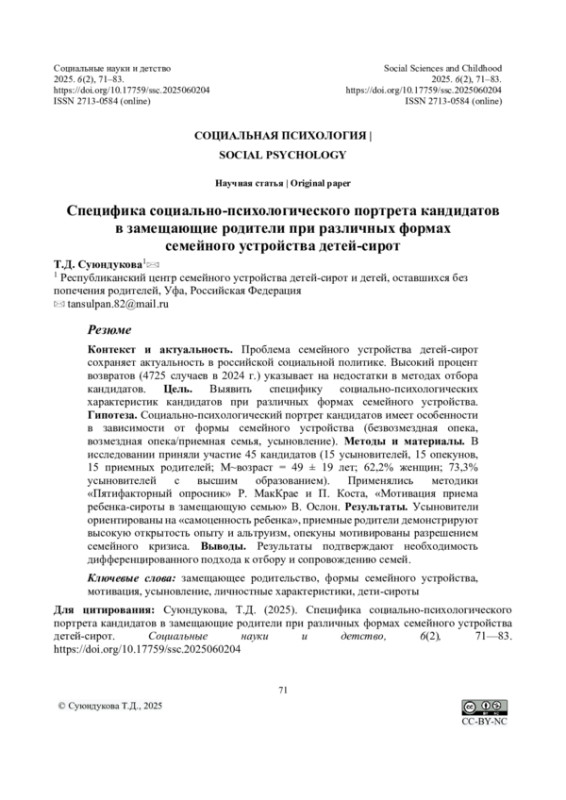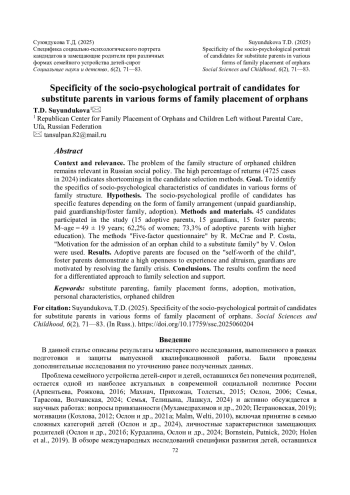 Контекст и актуальность. Проблема семейного устройства детей-сирот сохраняет актуальность в российской социальной политике. Высокий процент возвратов (4725 случаев в 2024 г.) указывает на недостатки в методах отбора кандидатов. Цель. Выявить специфику социально-психологических характеристик кандидатов при различных формах семейного устройства. Гипотеза. Социально-психологический портрет кандидатов имеет особенности в зависимости от формы семейного устройства (безвозмездная опека, возмездная опека/приемная семья, усыновление). Методы и материалы. В исследовании приняли участие 45 кандидатов (15 усыновителей, 15 опекунов, 15 приемных родителей; M~возраст = 49 ± 19 лет; 62,2% женщин; 73,3% усыновителей с высшим образованием). Применялись методики «Пятифакторный опросник» Р. МакКрае и П. Коста, «Мотивация приема ребенка-сироты в замещающую семью» В. Ослон. Результаты. Усыновители ориентированы на «самоценность ребенка», приемные родители демонстрируют высокую открытость опыту и альтруизм, опекуны мотивированы разрешением семейного кризиса. Выводы. Результаты подтверждают необходимость дифференцированного подхода к отбору и сопровождению семей.
