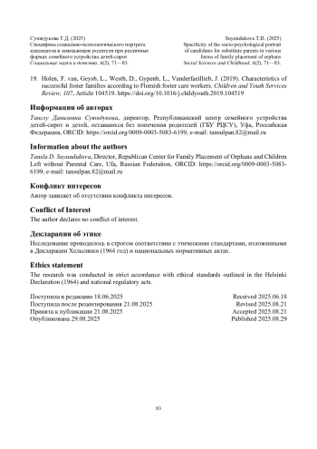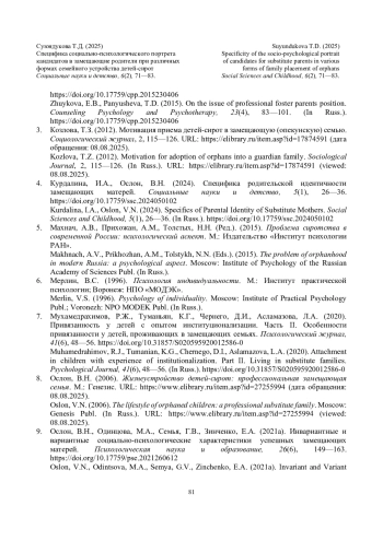 Oslon, V.N. (2006). The lifestyle of orphaned children: a professional substitute family. Moscow: Genesis Publ. (In Russ.). URL: https://www.elibrary.ru/item.asp?id=27255994 (viewed: 08.08.2025).