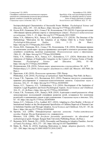 11. Ослон, В.Н., Одинцова, М.А., Семья, Г.В., Колесникова, У.В. (2024). Мотивация приема на воспитание детей-сирот трудноустраиваемых категорий в контексте различных форм семейного устройства, включая усыновление. Психологическая наука и образование, 29(6), 81-98. DOI: 10.17759/pse.2024290606 EDN: FQROCE