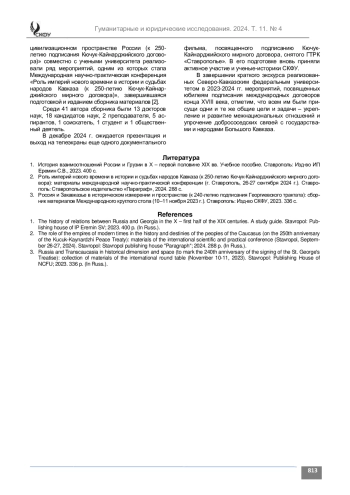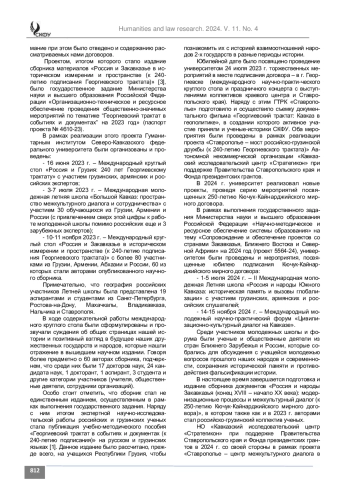Для цитирования: Кудрявцев А. А., Судавцов Н. Д. Научно-практические мероприятия СКФУ 2023-2024 гг., приуроченные к юбилейным датам со дня подписания международных договоров, как фактор сохранения исторической памяти у учащейся молодежи. Гуманитарные и юридические исследования. 2024;11(4):811-813. https://doi. org/10.37493/2409-1030.2024.4.26