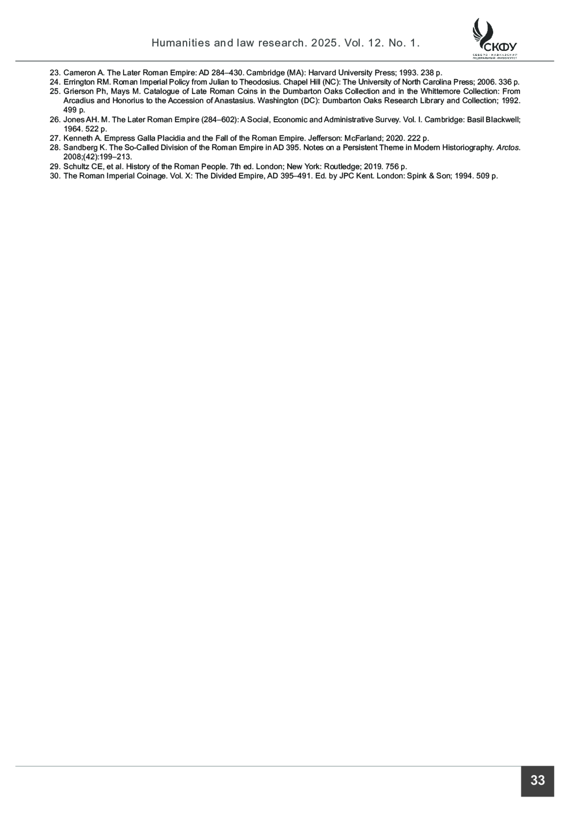 10. Казаков М. М. Начало последней династии Римской империи // Известия Смоленского государственного университета. 2020. № 4(52). С. 220-236.