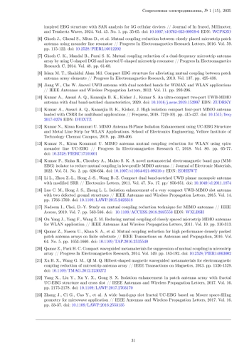 13. Kumar N., Kiran Kommuri U. MIMO antenna mutual coupling reduction for WLAN using spiro meander line UC-EBG // Progress In Electromagnetics Research C, 2018. Vol. 80. pp. 65-77. DOI: 10.2528/PIERC17101601