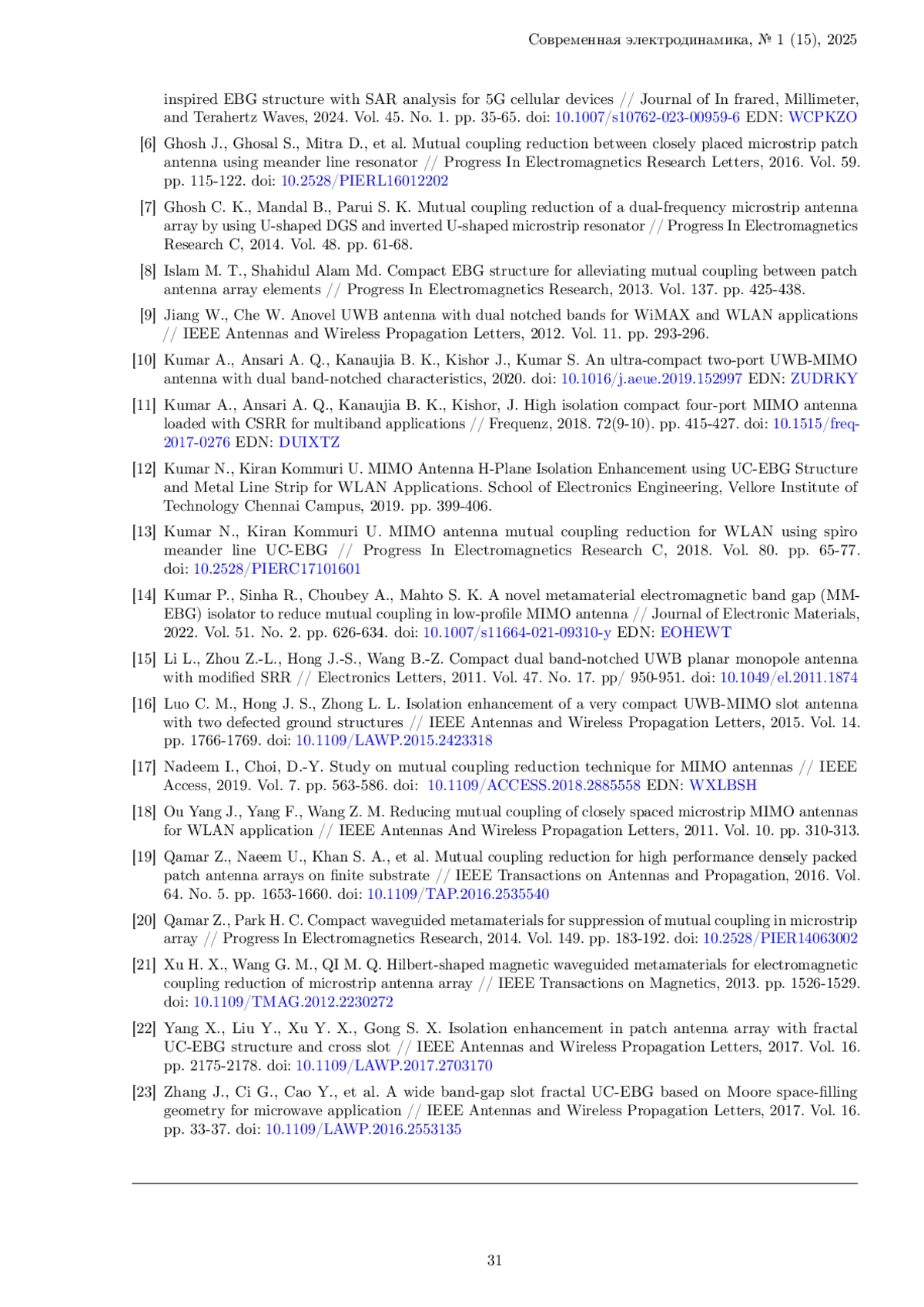 23. Zhang J., Ci G., Cao Y., et al. A wide band-gap slot fractal UC-EBG based on Moore space-filling geometry for microwave application // IEEE Antennas and Wireless Propagation Letters, 2017. Vol. 16. pp. 33-37.