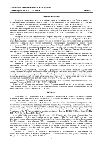 2. Герасимов Н. П. Дубовскова М. П., Колпаков В. И. Влияние сезона выращивания герефордских бычков на биоконверсию питательных веществ и энергии корма в мясную продукцию // Роль ветеринарной и зоотехнической науки на современном этапе развития животноводства: материалы Всероссийской научно практической конференции. Ижевск: ФГБОУ ВО Ижевская ГСХА, 2021. С. 89-93. EDN: IEEWIV