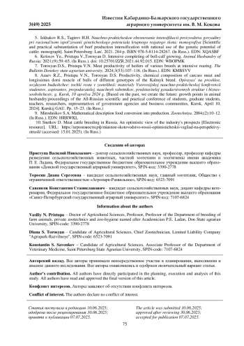 7. Торосян Д. С. Приступа В. Н. Мясная продуктивность телок различных пород при интенсивном доращивании // Вестник Донского государственного аграрного университета. 2024. № 3 (53). С. 107-116. EDN: KMBSVV