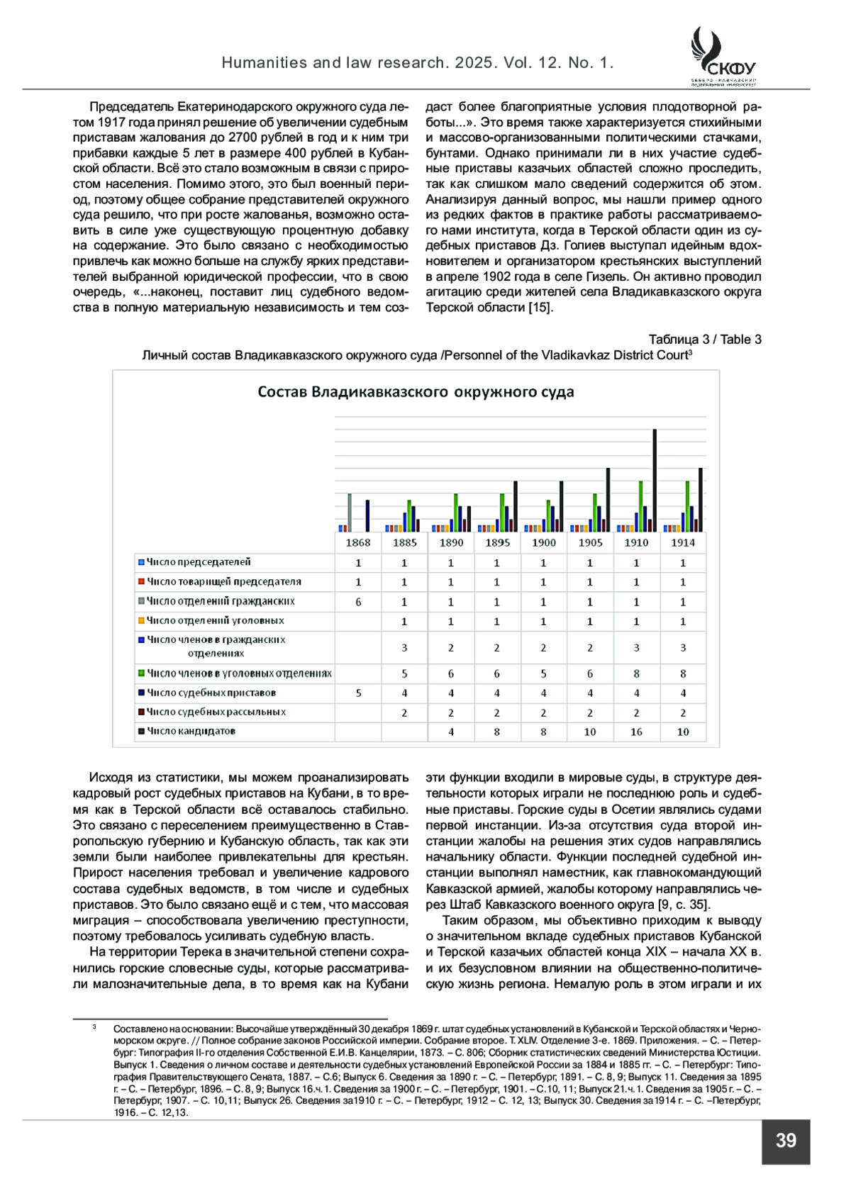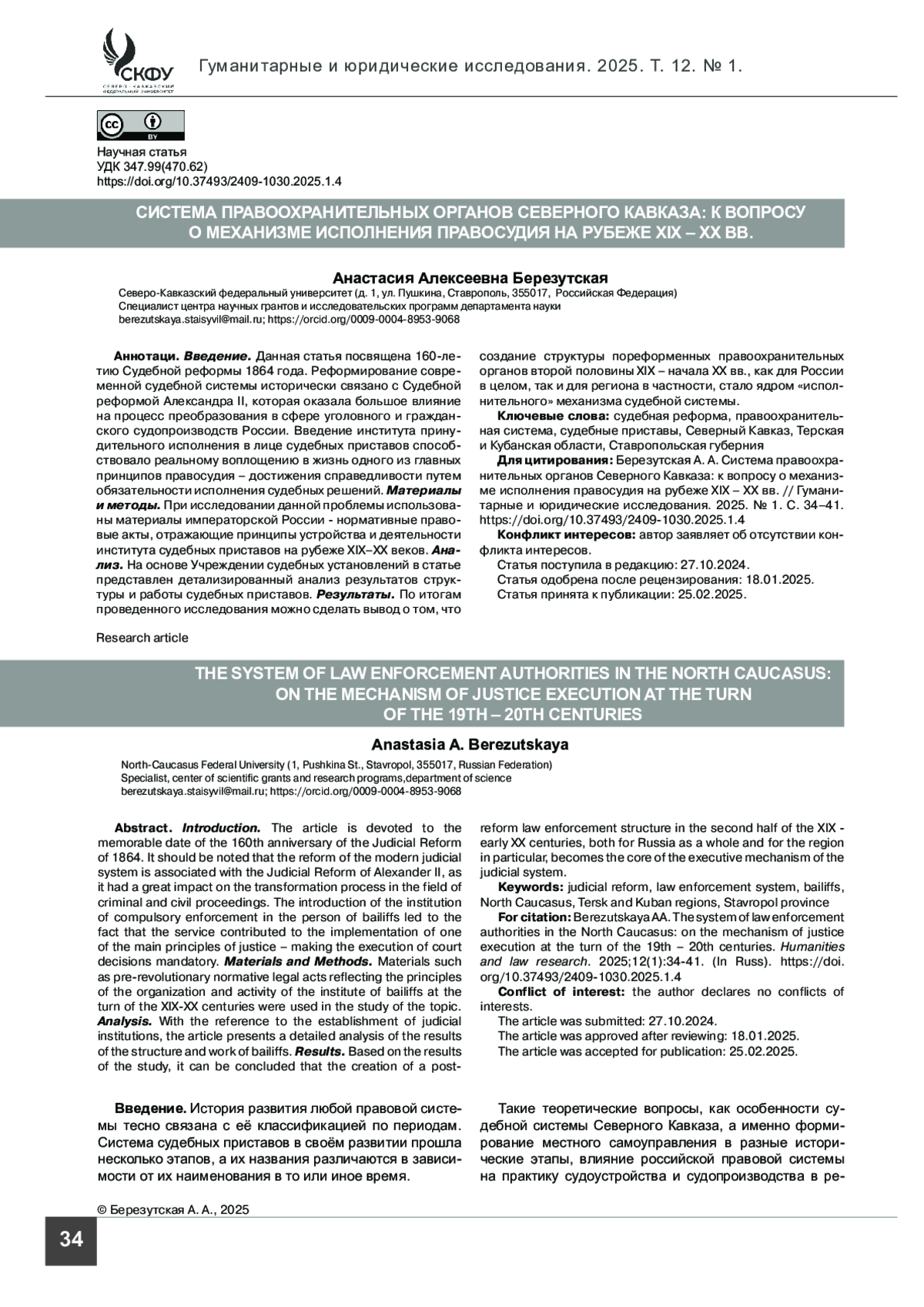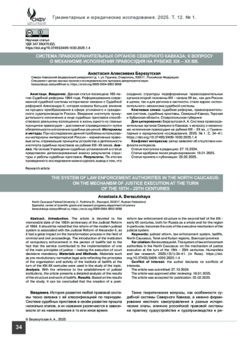 Результаты. По итогам проведенного исследования можно сделать вывод о том, что создание структуры пореформенных правоохранительных органов второй половины XIX – начала ХХ вв., как для России в целом, так и для региона в частности, стало ядром «исполнительного» механизма судебной системы.