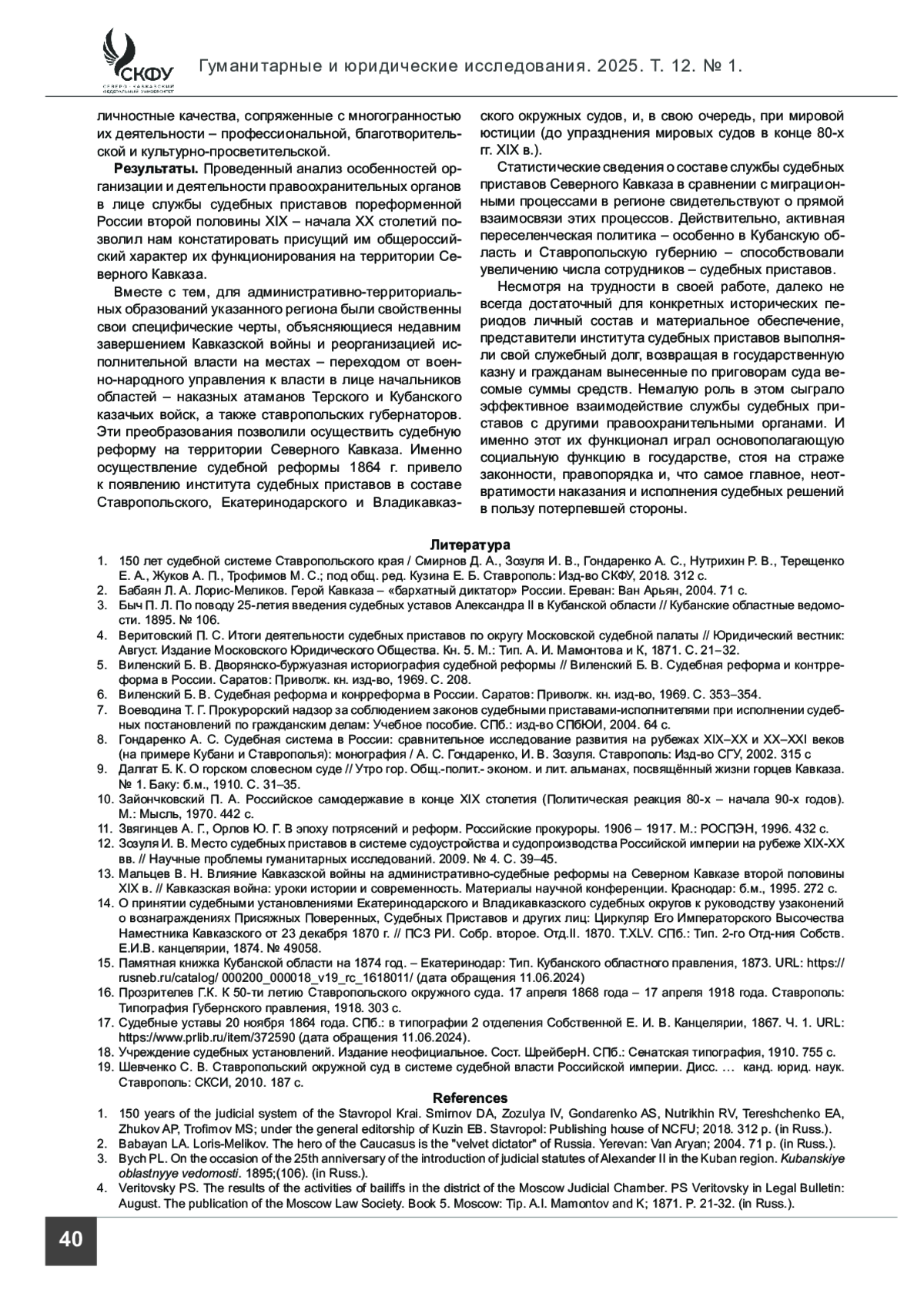 12. Зозуля И. В. Место судебных приставов в системе судоустройства и судопроизводства Российской империи на рубеже XIX-ХХ вв. // Научные проблемы гуманитарных исследований. 2009. № 4. С. 39-45.