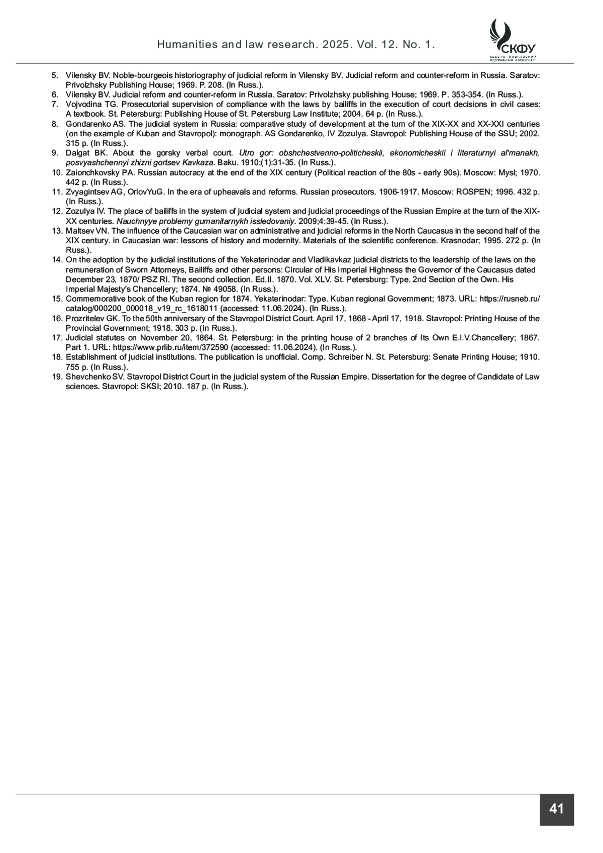 13. Мальцев В. Н. Влияние Кавказской войны на административно-судебные реформы на Северном Кавказе второй половины XIX в. // Кавказская война: уроки истории и современность. Материалы научной конференции. Краснодар: б.м., 1995. 272 с.