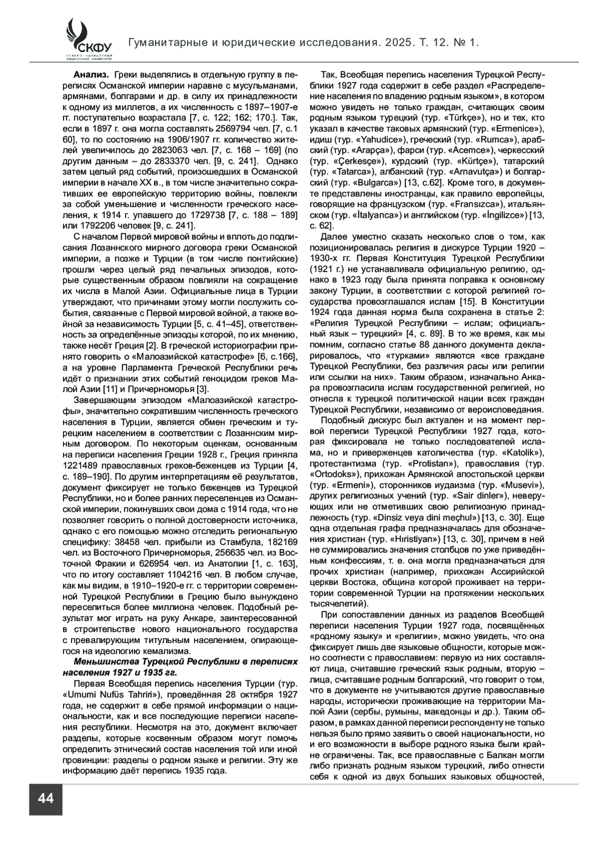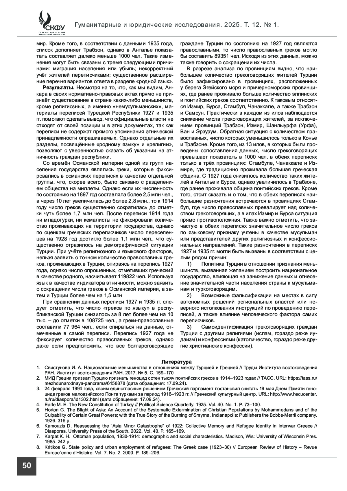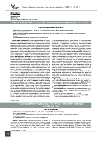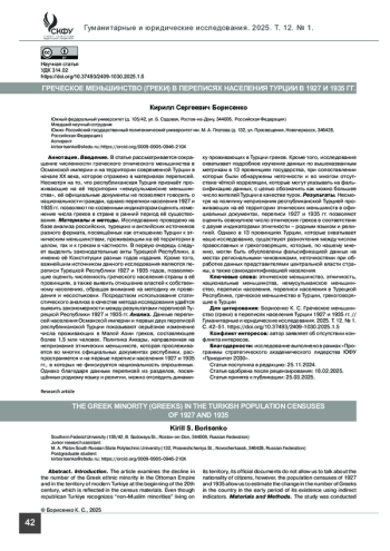Введение. В статье рассматривается сокращение численности греческого этнического меньшинства в Османской империи и на территории современной Турции в начале XX века, которое отражено в материалах переписей. Несмотря на то, что республиканская Турция признаёт проживающие на её территории «немусульманские меньшинства», её официальные документы не позволяют говорить о национальности граждан, однако переписи населения 1927 и 1935 гг. позволяют по косвенным индикаторам оценить изменение числа греков в стране в ранний период её существования.