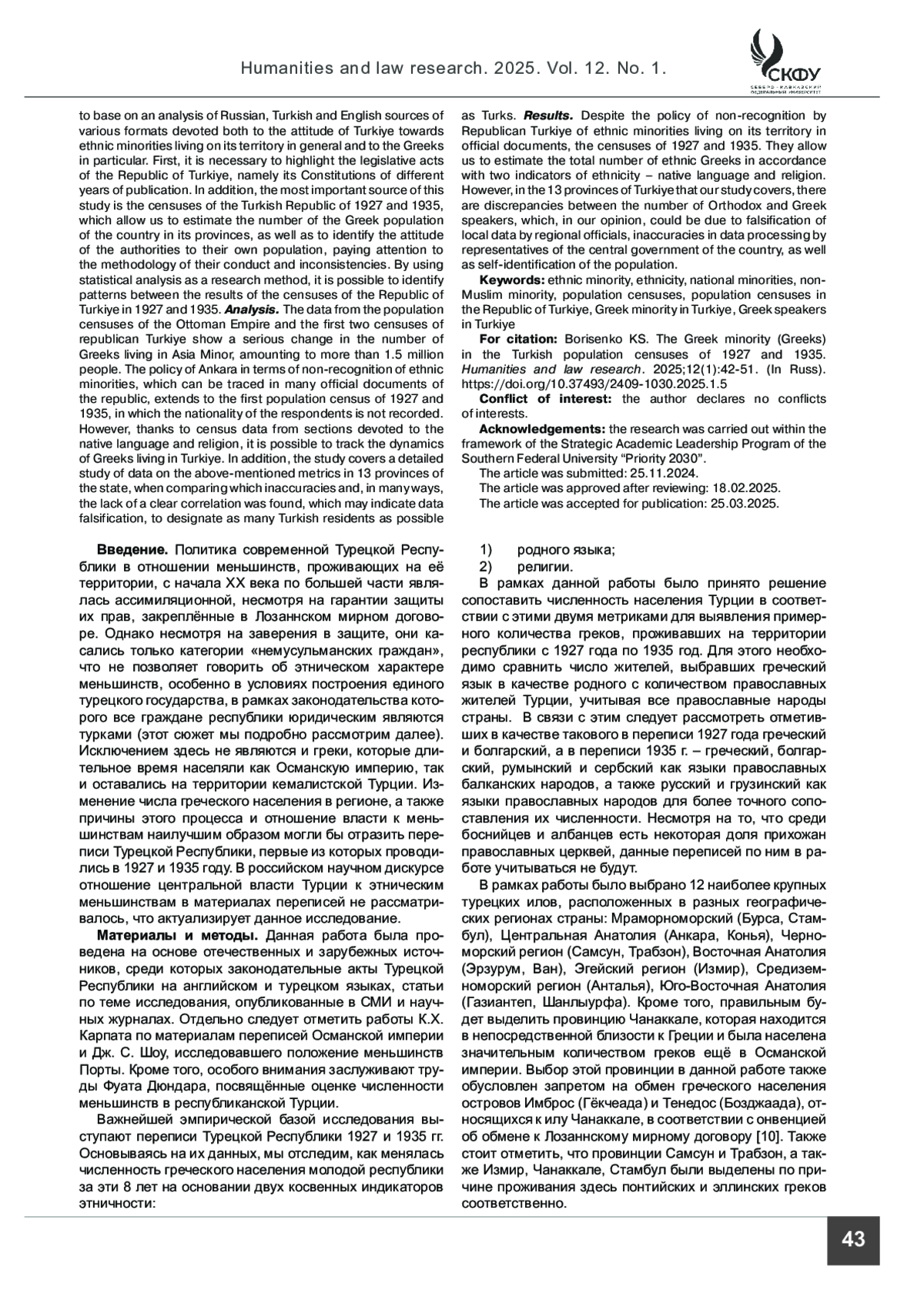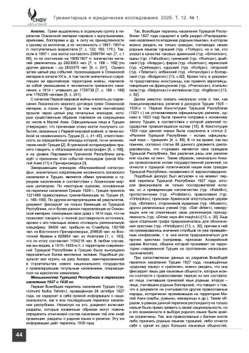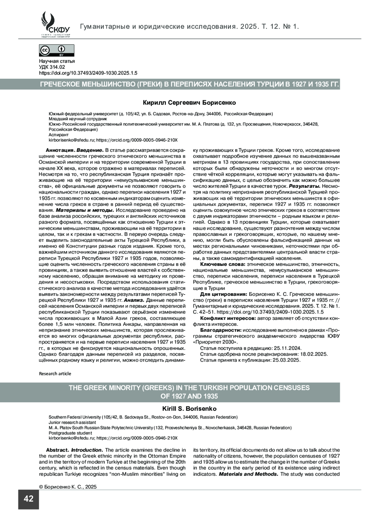 Материалы и методы. Исследование проведено на базе анализа российских, турецких и английских источников разного формата, посвящённых как отношению Турции к этническим меньшинствам, проживающим на её территории в целом, так и к грекам в частности. В первую очередь следует выделить законодательные акты Турецкой Республики, а именно её Конституции разных годов издания. Кроме того, важнейшим источником данного исследования являются переписи Турецкой Республики 1927 и 1935 годов, позволяющие оценить численность греческого населения страны в её провинциях, а также выявить отношение властей к собственному населению, обращая внимание на методику их проведения и несостыковки. Посредством использования статистического анализа в качестве метода исследования удаётся выявить закономерности между результатами переписей Турецкой Республики 1927 и 1935 гг.