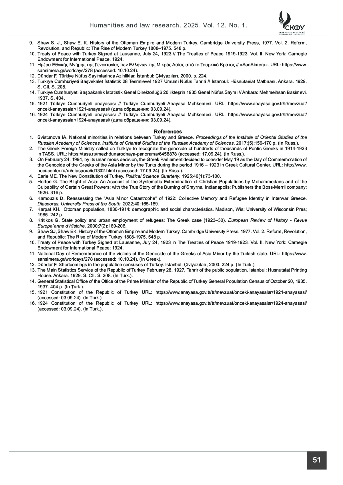 1. Свистунова И. А. Национальные меньшинства в отношениях между Турцией и Грецией // Труды Института востоковедения РАН. Институт востоковедения РАН. 2017. № 5. С. 159-170