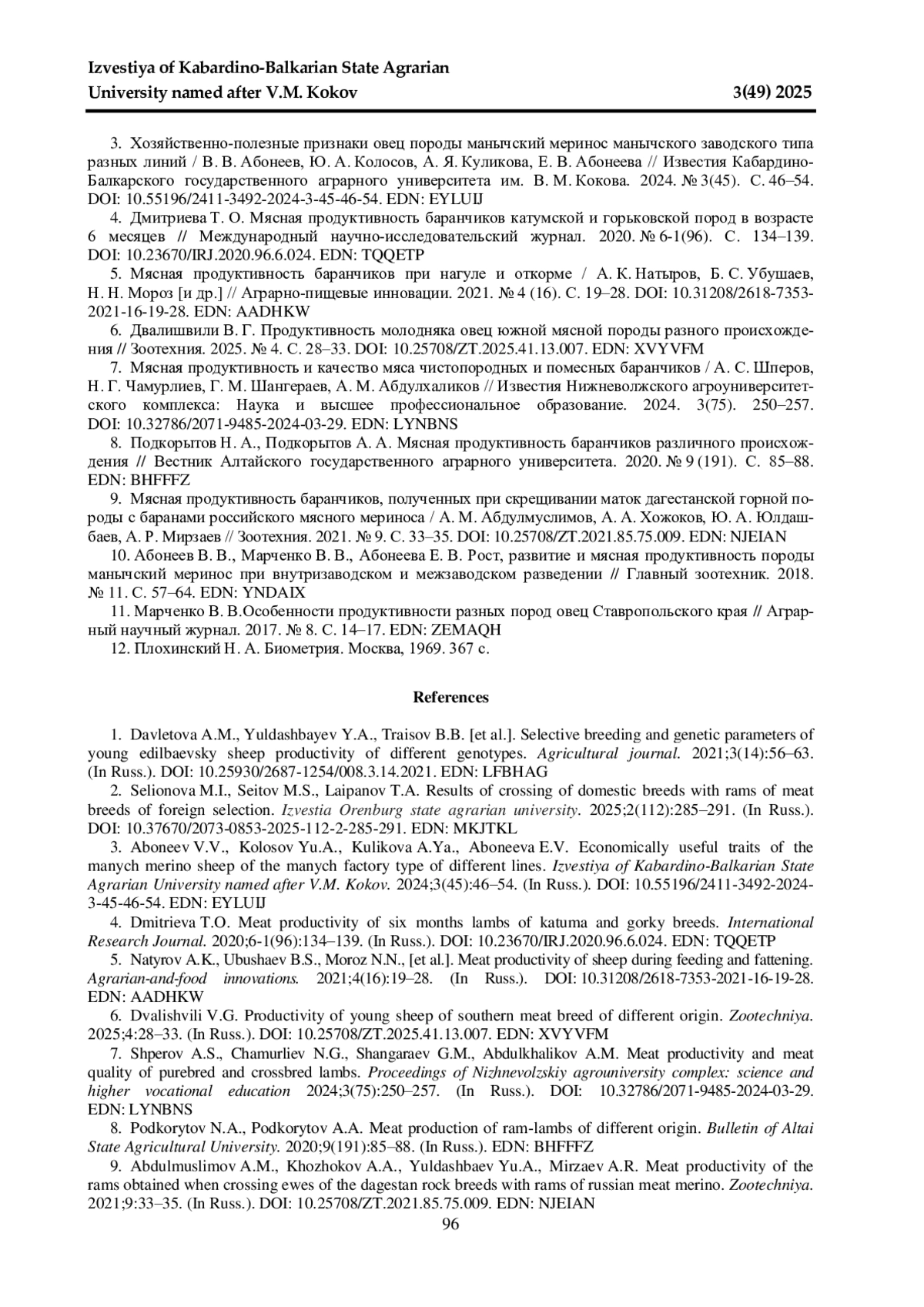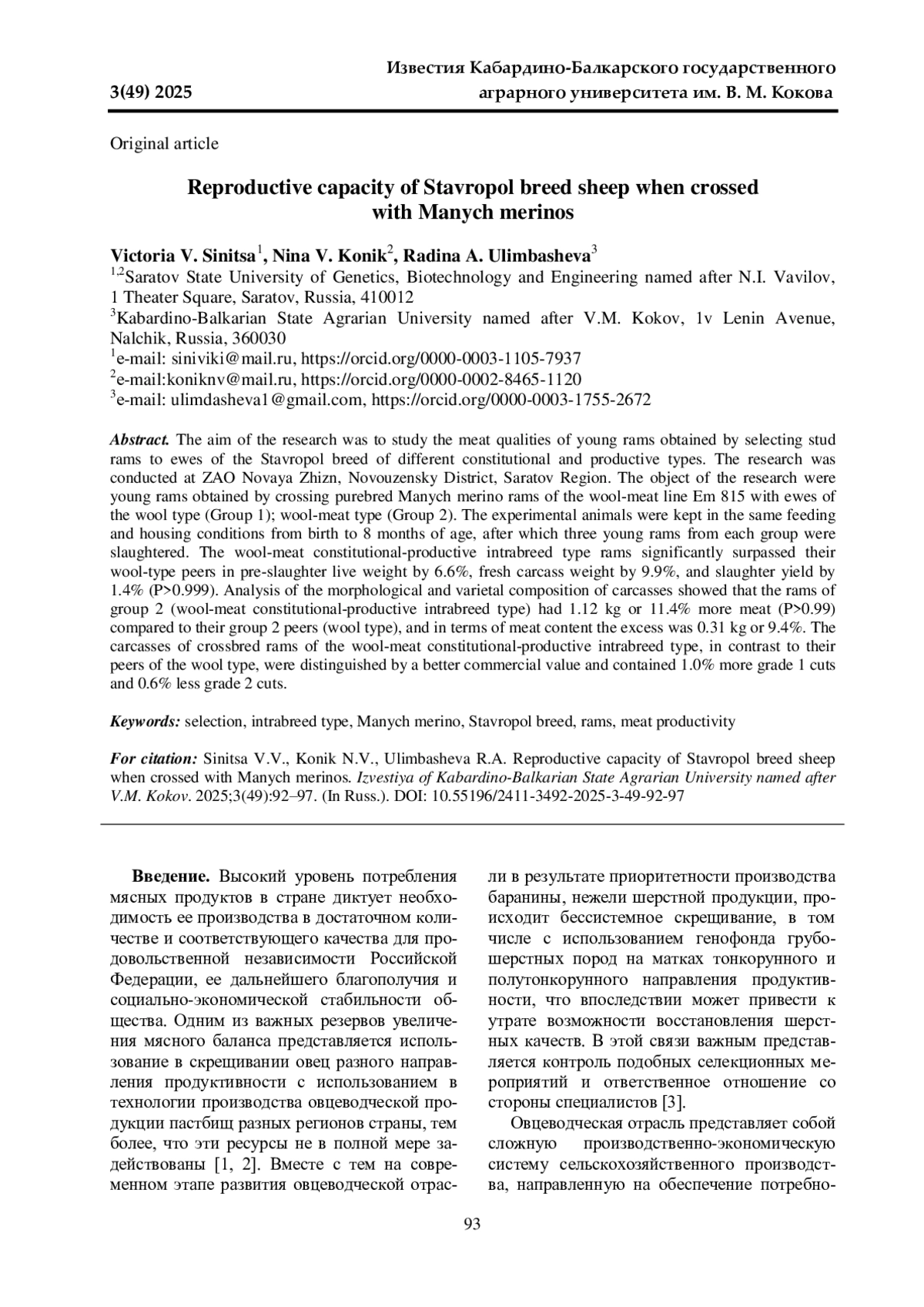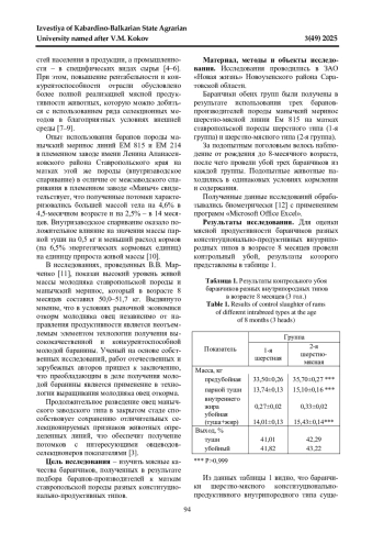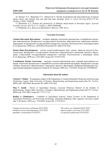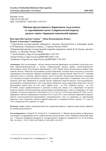 СИНИЦА В. В., КОНИК Н. В., УЛИМБАШЕВА Р. А. МЯСНАЯ ПРОДУКТИВНОСТЬ БАРАНЧИКОВ, ПОЛУЧЕННЫХ ОТ СКРЕЩИВАНИЯ МАТОК СТАВРОПОЛЬСКОЙ ПОРОДЫ РАЗНЫХ ТИПОВ С БАРАНАМИ МАНЫЧСКИЙ МЕРИНОС // ИЗВЕСТИЯ КАБАРДИНО-БАЛКАРСКОГО ГОСУДАРСТВЕННОГО АГРАРНОГО УНИВЕРСИТЕТА ИМ. В. М. КОКОВА. 2025. № 3 (49)