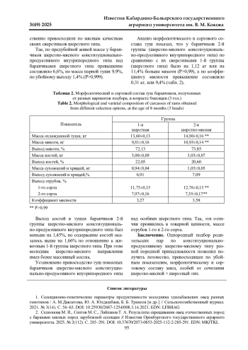 Статья: МЯСНАЯ ПРОДУКТИВНОСТЬ БАРАНЧИКОВ, ПОЛУЧЕННЫХ ОТ СКРЕЩИВАНИЯ МАТОК СТАВРОПОЛЬСКОЙ ПОРОДЫ РАЗНЫХ ТИПОВ С БАРАНАМИ МАНЫЧСКИЙ МЕРИНОС (2025)
