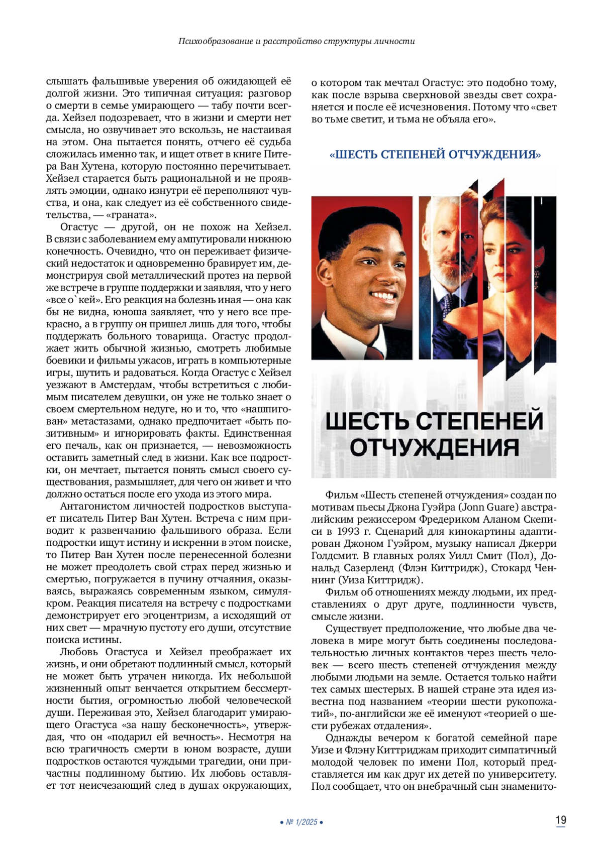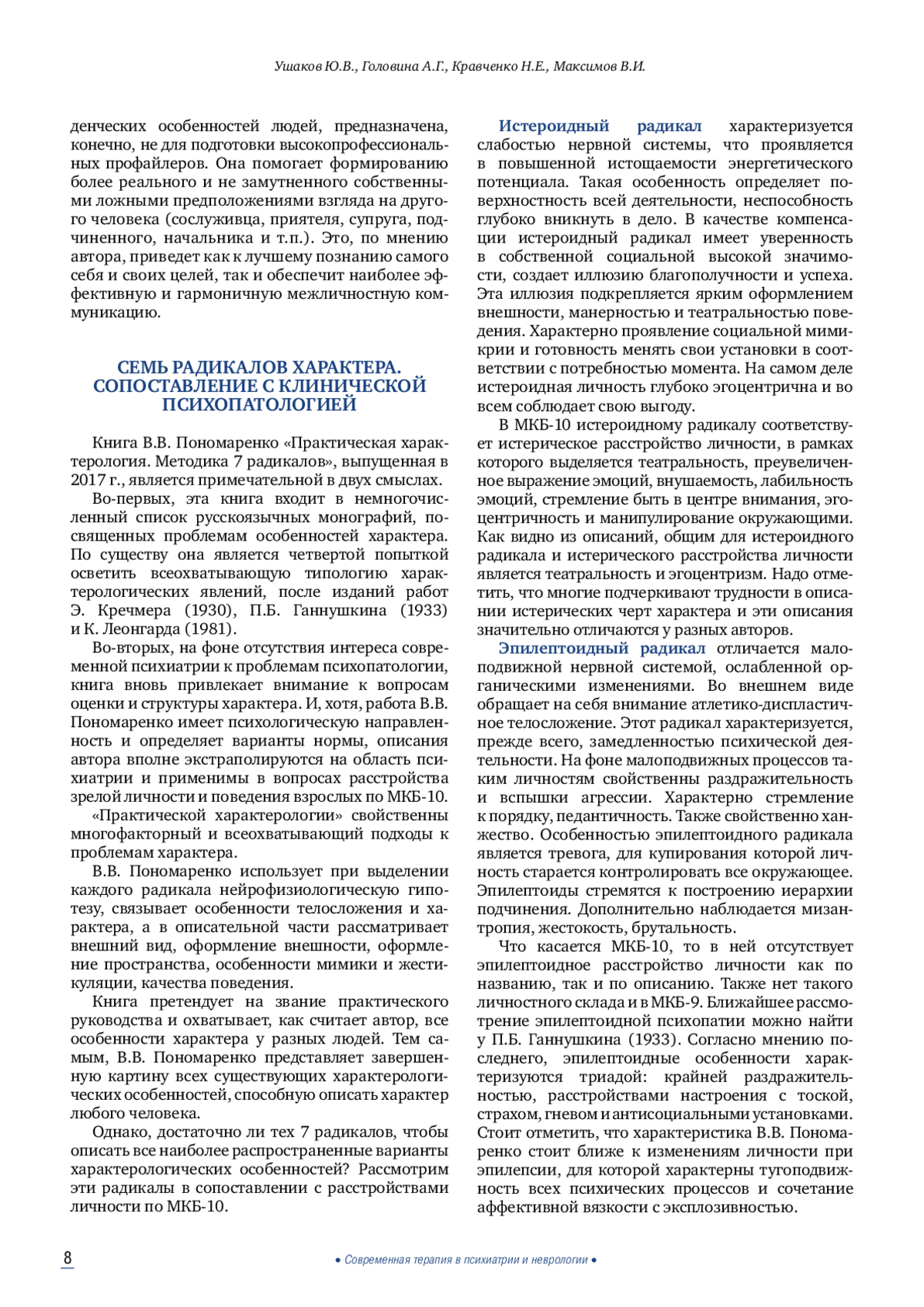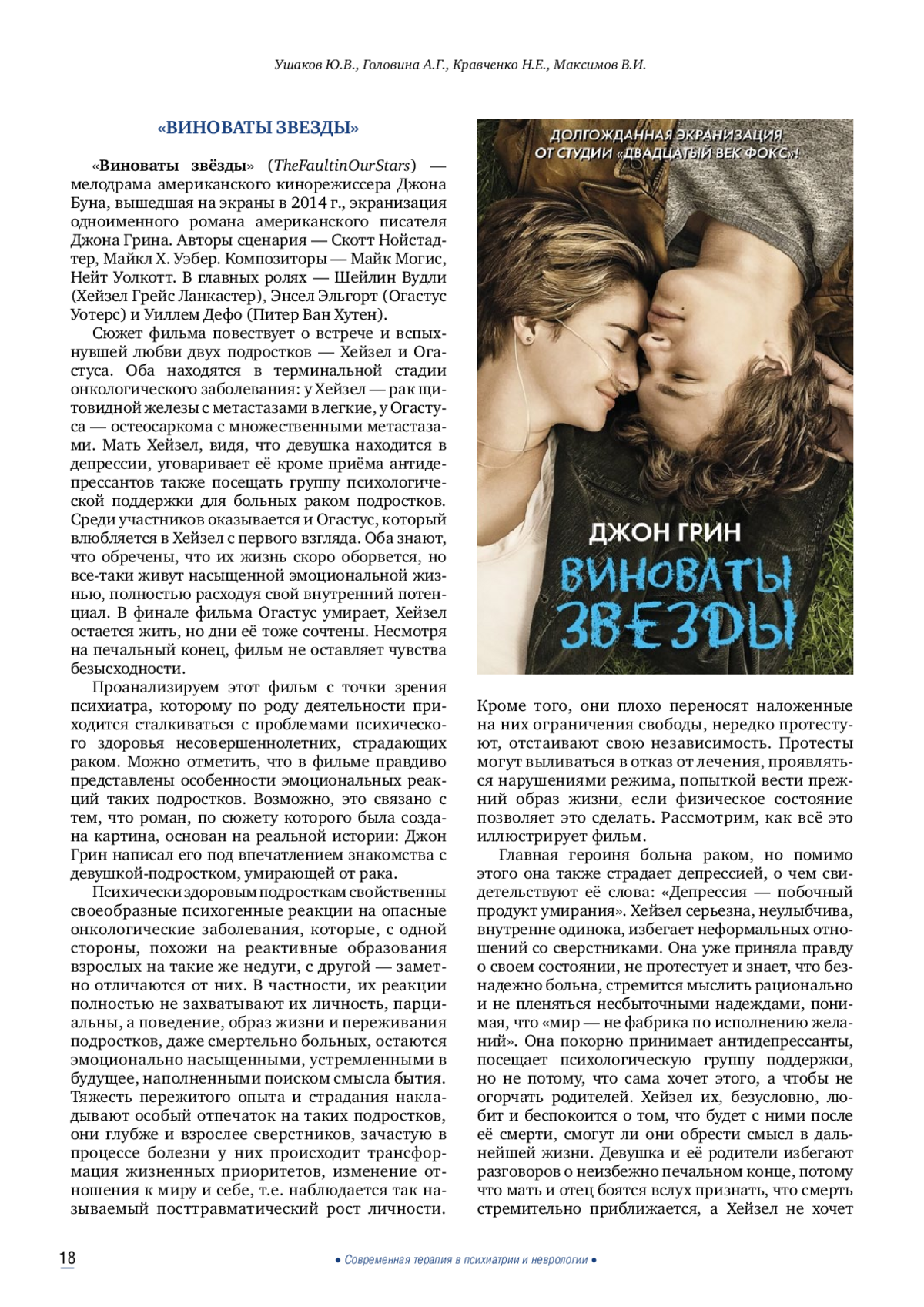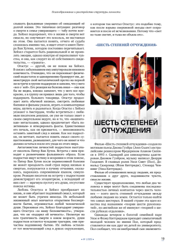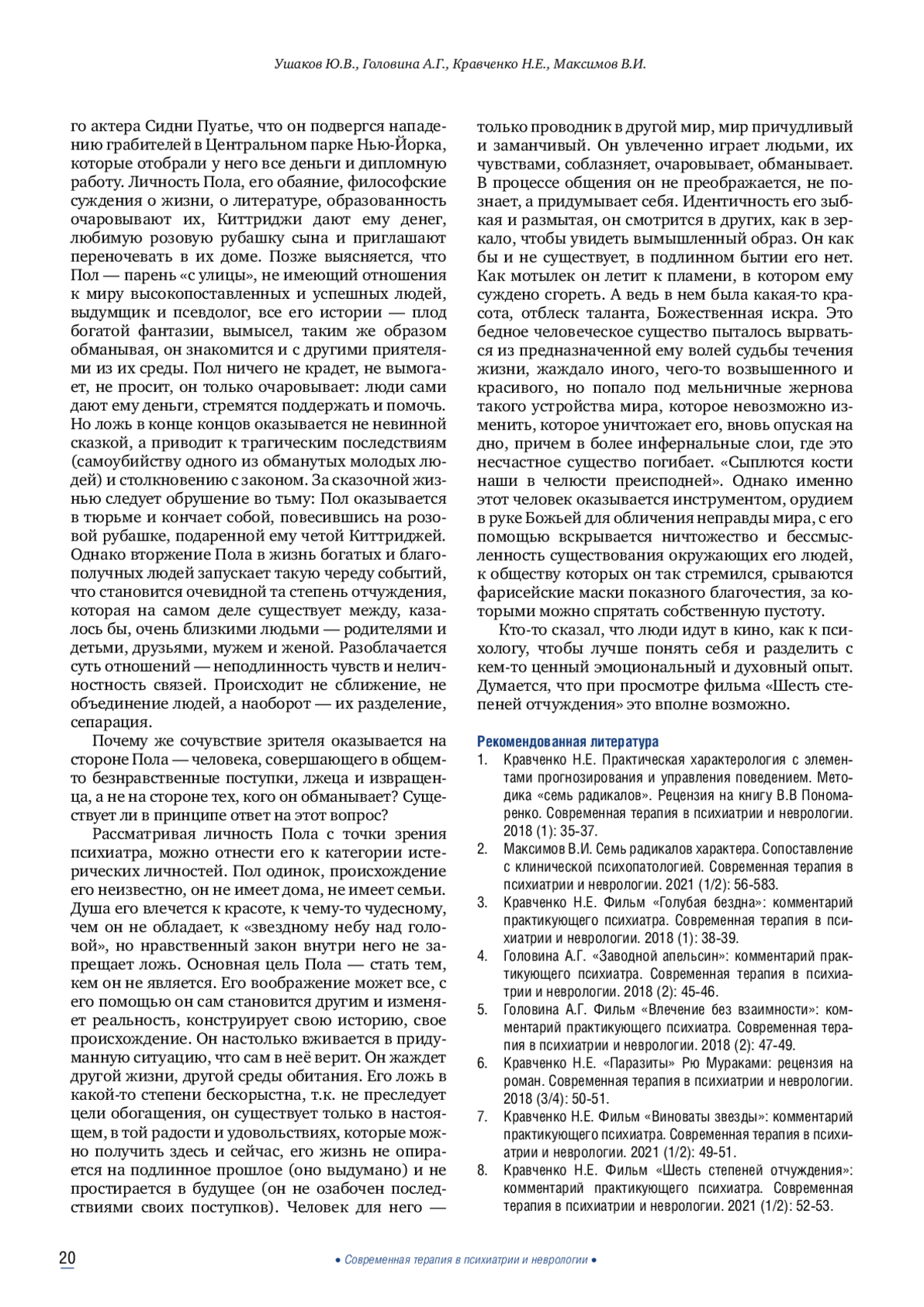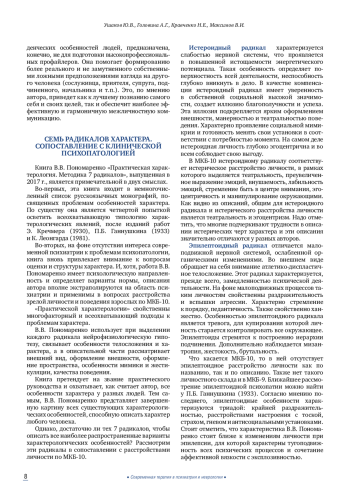 Психообразование представляет собой информирование психически больных или их родственников о проявлениях психических заболеваний, обучение основам психиатрической грамотности и навыкам совладания с болезнью. В более ранних номерах журнала «Современная терапия в психиатрии и неврологии» были опубликованы две рецензии наших постоянных авторов на книгу В. В. Пономаренко «Практическая характерология с элементами прогнозирования и управления поведением. Методика «семь радикалов». С течением времени методика только усиливает свои позиции как реальный клинический инструмент в руках практикующих психиатров и психотерапевтов. Представленные в этом обзоре рецензии на фильмы и литературные произведения, подготовленные опытными психиатрами, призваны проиллюстрировать базисные «радикалы» описанием личностей главных героев. Такая визуализация поможет врачам, пациентам и родственникам пациентов в корректном сопровождении клинически диагностированного патологического состояния больного.