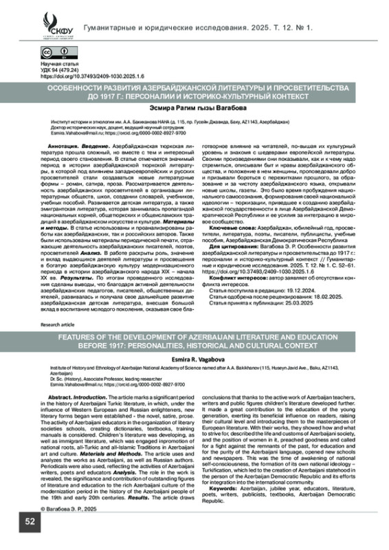 Материалы и методы. В статье использованы и проанализированы работы как азербайджанских, так и российских авторов. Также были использованы материалы периодической печати, отражающие деятельность азербайджанских писателей, поэтов, просветителей.