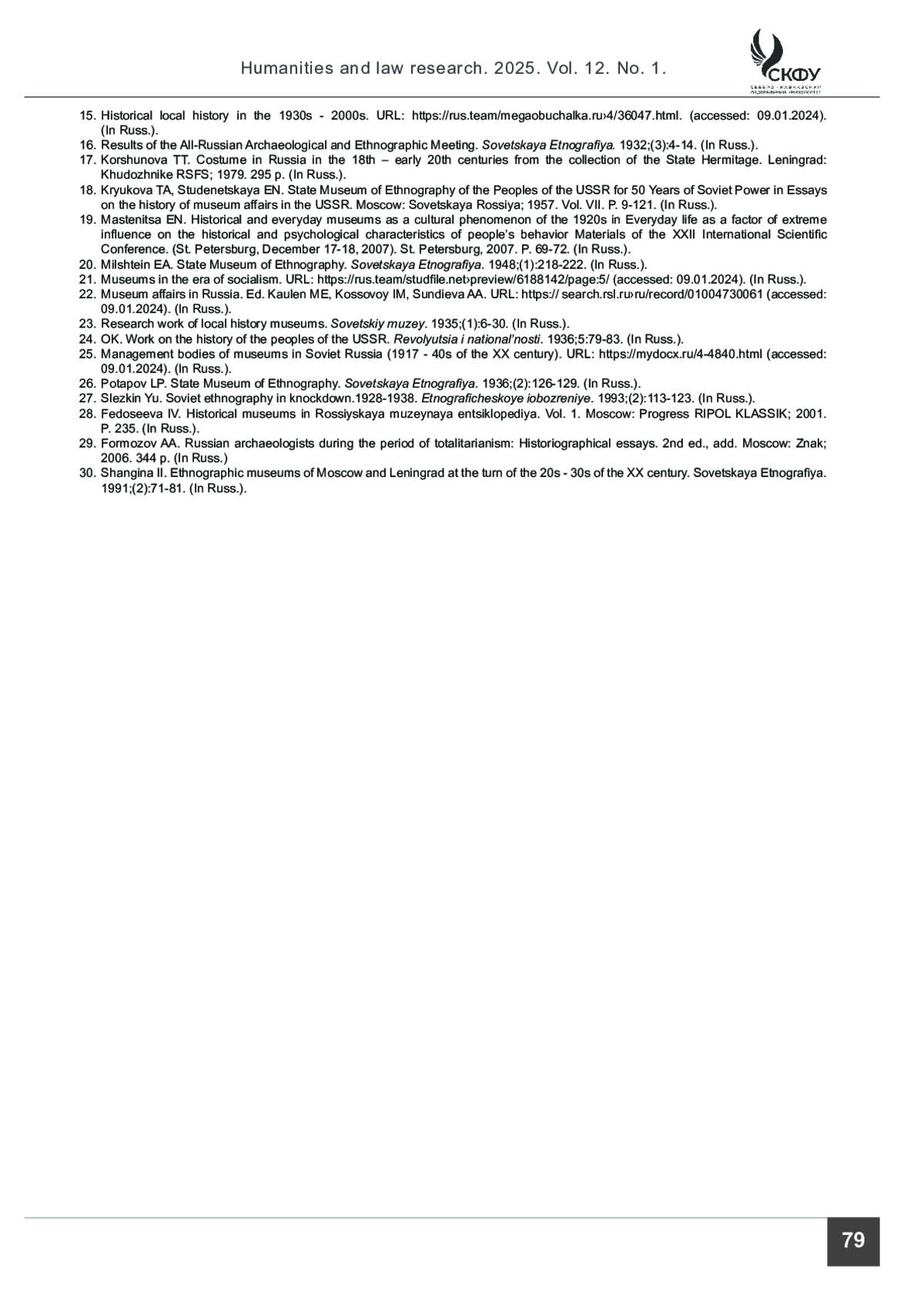 30. Шангина И. И. Этнографические музеи Москвы и Ленинграда на рубеже 20-х 30-х годов XX века. // Советская этнография. 1991. № 2. С. 71-81.