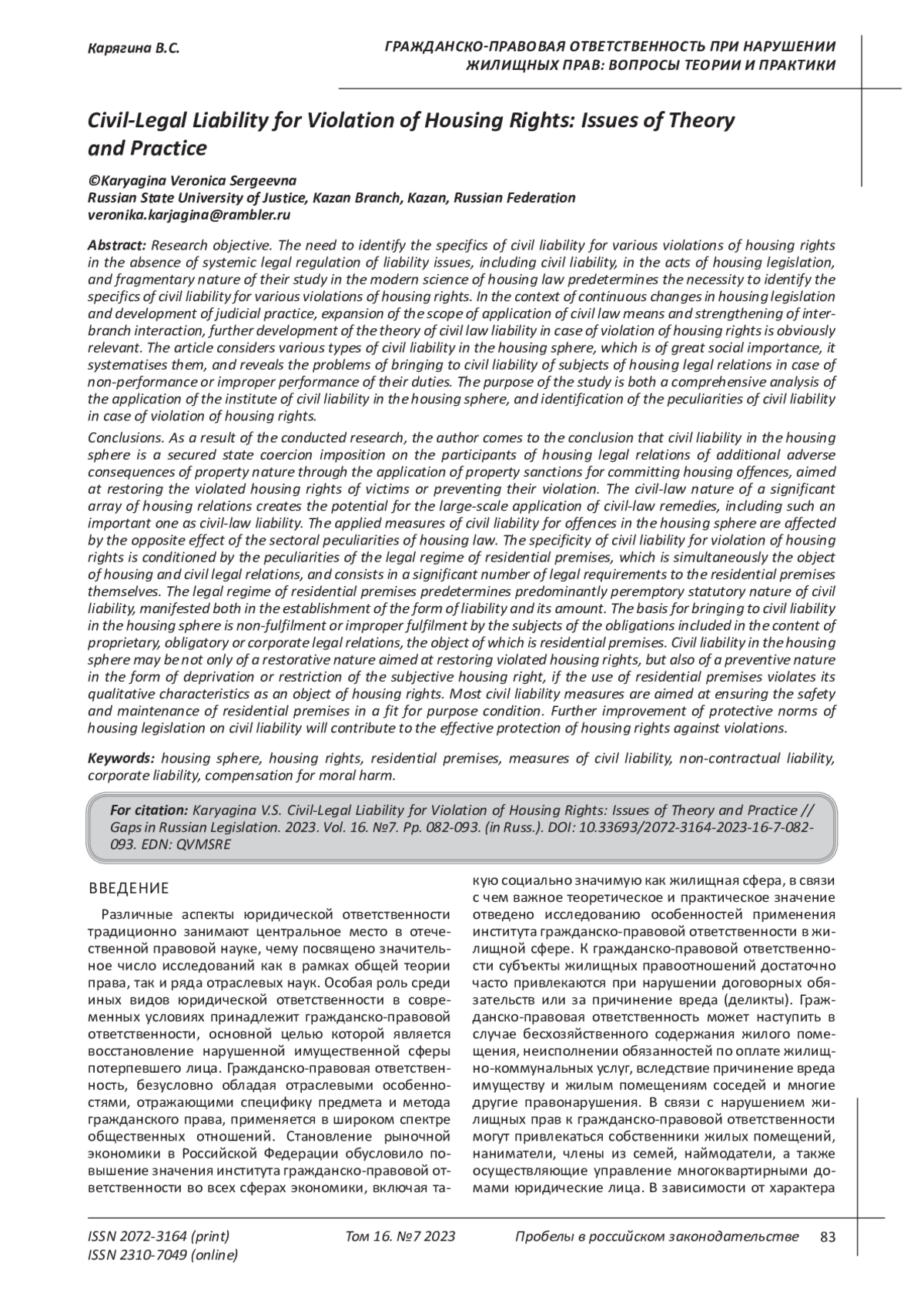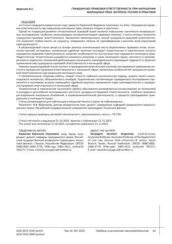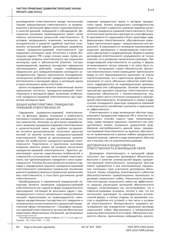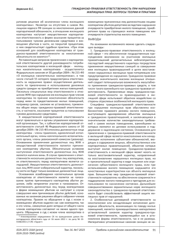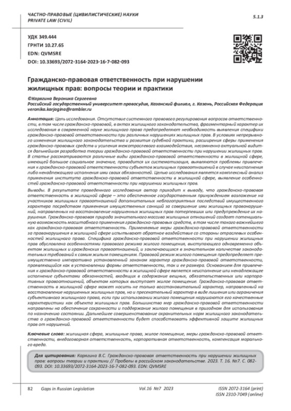 Цель исследования. Отсутствие системного правового регулирования вопросов ответственности, в том числе гражданско-правовой, в актах жилищного законодательства, фрагментарный характер их исследования в современной науке жилищного права предопределяют необходимость выявления специфики гражданско-правовой ответственности при различных нарушениях жилищных прав. В условиях непрерывного изменения жилищного законодательства и развития судебной практики, расширения сферы применения гражданско-правовых средств и усиления межотраслевого взаимодействия, несомненно актуальной видится дальнейшая разработка теории гражданско-правовой ответственности при нарушении жилищных прав. В статье рассматриваются различные виды гражданско-правовой ответственности в жилищной сфере, имеющей большое социальное значение, проводится их систематизация, выявляются проблемы привлечения к гражданско-правовой ответственности субъектов жилищных правоотношений в случае неисполнения либо ненадлежащего исполнения ими своих обязанностей. Целью исследования является комплексный анализ применения института гражданско-правовой ответственности в жилищной сфере, выявление особенностей гражданско-правовой ответственности при нарушении жилищных прав. Выводы. В результате проведенного исследования автор приходит к выводу, что гражданско-правовая ответственность в жилищной сфере - это обеспеченное государственным принуждением возложение на участников жилищных правоотношений дополнительных неблагоприятных последствий имущественного характера посредством применения имущественных санкций за совершение ими жилищных правонарушений, направленных на восстановление нарушенных жилищных прав потерпевших или предупреждение их нарушения. Гражданско-правовая природа значительного массива жилищных отношений создает потенциальную возможность масштабного применения гражданско-правовых средств, в том числе такого важнейшего как гражданско-правовая ответственность. Применяемые меры гражданско-правовой ответственности за правонарушения в жилищной сфере испытывают обратное воздействие со стороны отраслевых особенностей жилищного права. Специфика гражданско-правовой ответственности при нарушении жилищных прав обусловлена особенностями правового режима жилого помещения, выступающего одновременно объектом жилищных и гражданских правоотношений, и заключающихся в значительном количестве законодательных требований к самим жилым помещениям. Правовой режим жилого помещения предопределяет преимущественно императивно установленный законом характер гражданско-правовой ответственности, проявляющийся как в установлении формы ответственности, так и ее размера. Основанием для привлечения к гражданско-правовой ответственности в жилищной сфере является неисполнение или ненадлежащее исполнение субъектами обязанностей, входящих в содержание вещных, обязательственных или корпоративных правоотношений, объектом которых выступает жилое помещение. Гражданско-правовая ответственность в жилищной сфере может носить не только восстановительный характер, направленный на восстановление нарушенных жилищных прав, но и пресекательный характер в виде лишения или ограничения субъективного жилищного права, если при использовании жило