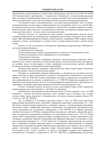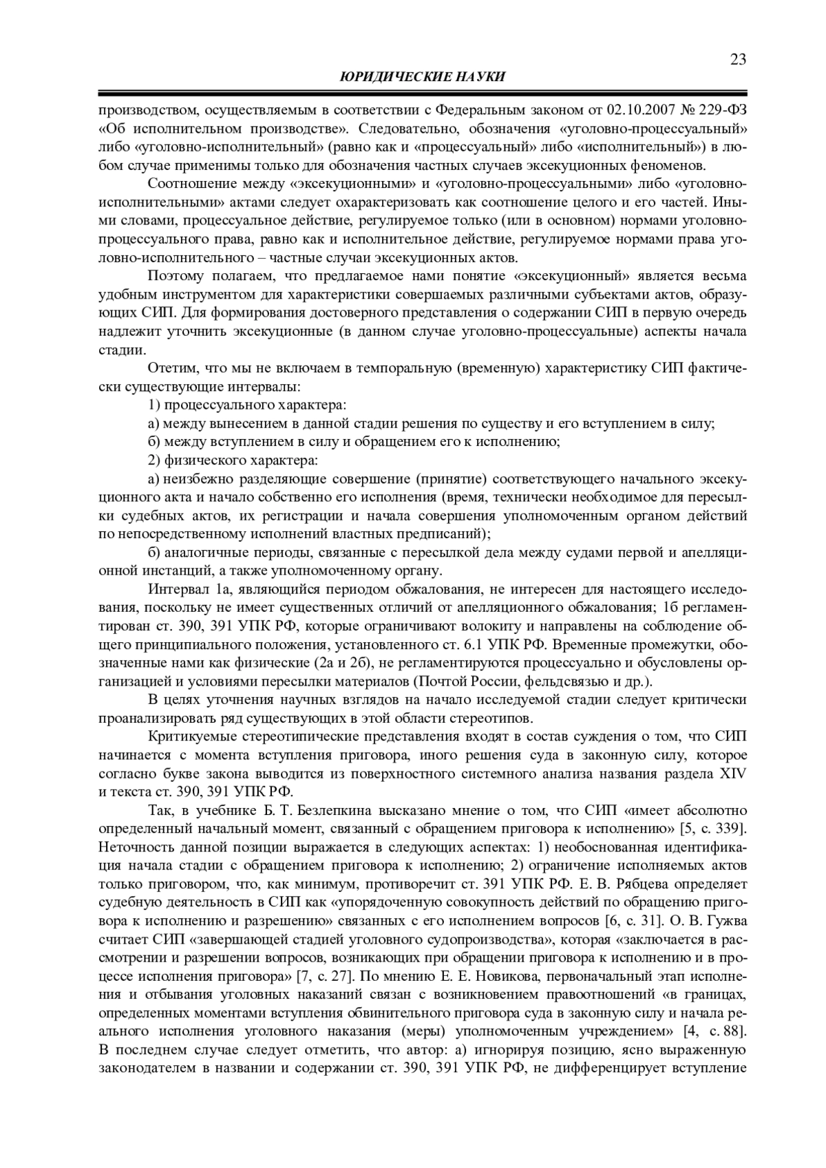 Основанное на наименовании раздела XIV УПК РФ, и казалось бы, обусловленное им понимание содержания стадии исполнения приговора (далее – СИП) как начинающейся с обращения приговора к исполнению не соответствует ни легально-юридическому, ни фактически эксекуционному (эксекуционный – от англ. execution – исполнение) содержанию стадии, а также способствует неверному доктринальному пониманию СИП.
